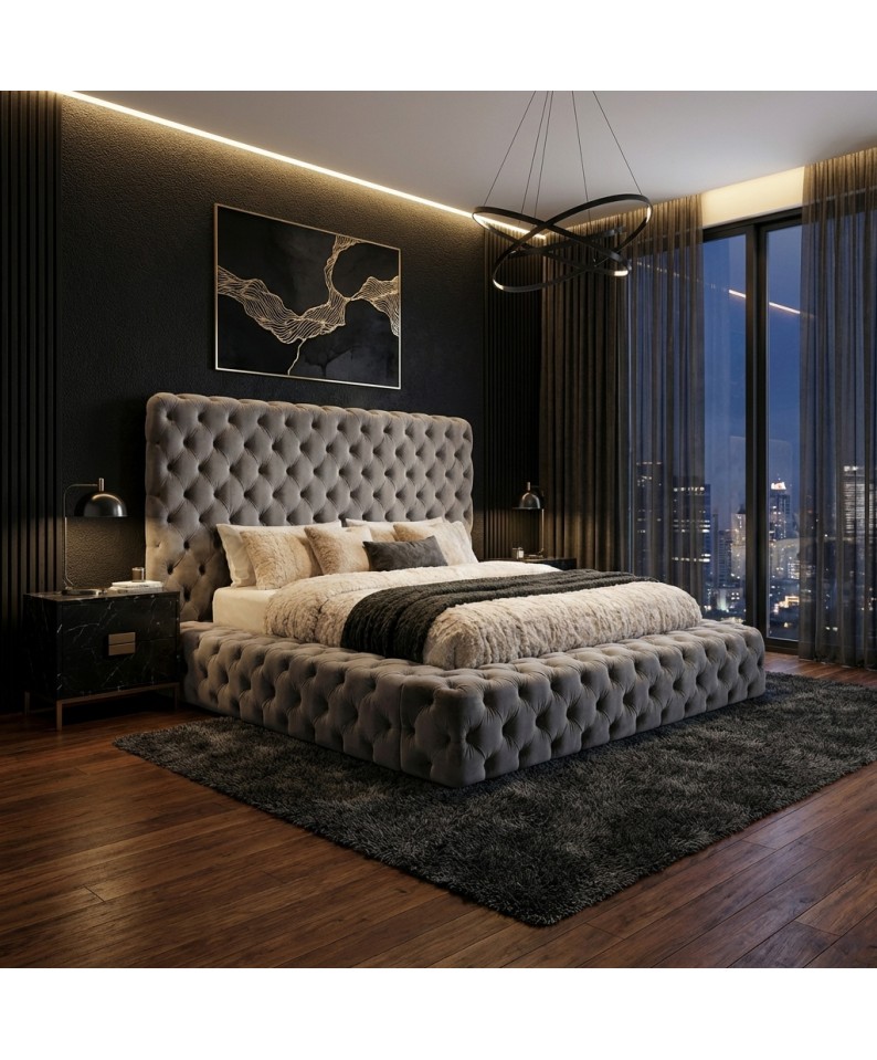 The headboard is tall and imposing, with the same capitonné workmanship as the rest of the structure. The footboard is lower and has a slightly curved shape, adding an element of softness to the design. The structure is supported by low, barely visible feet in light wood, which add a touch of warmth and naturalness.