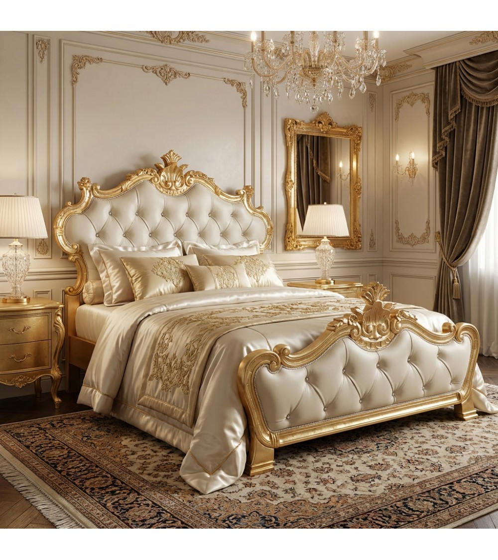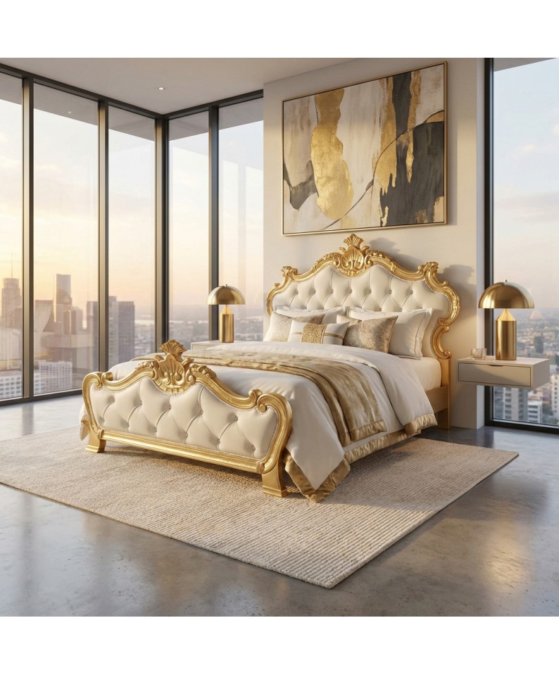 Double bed container in Baroque eco-leather, gold or silver wood Beatrice