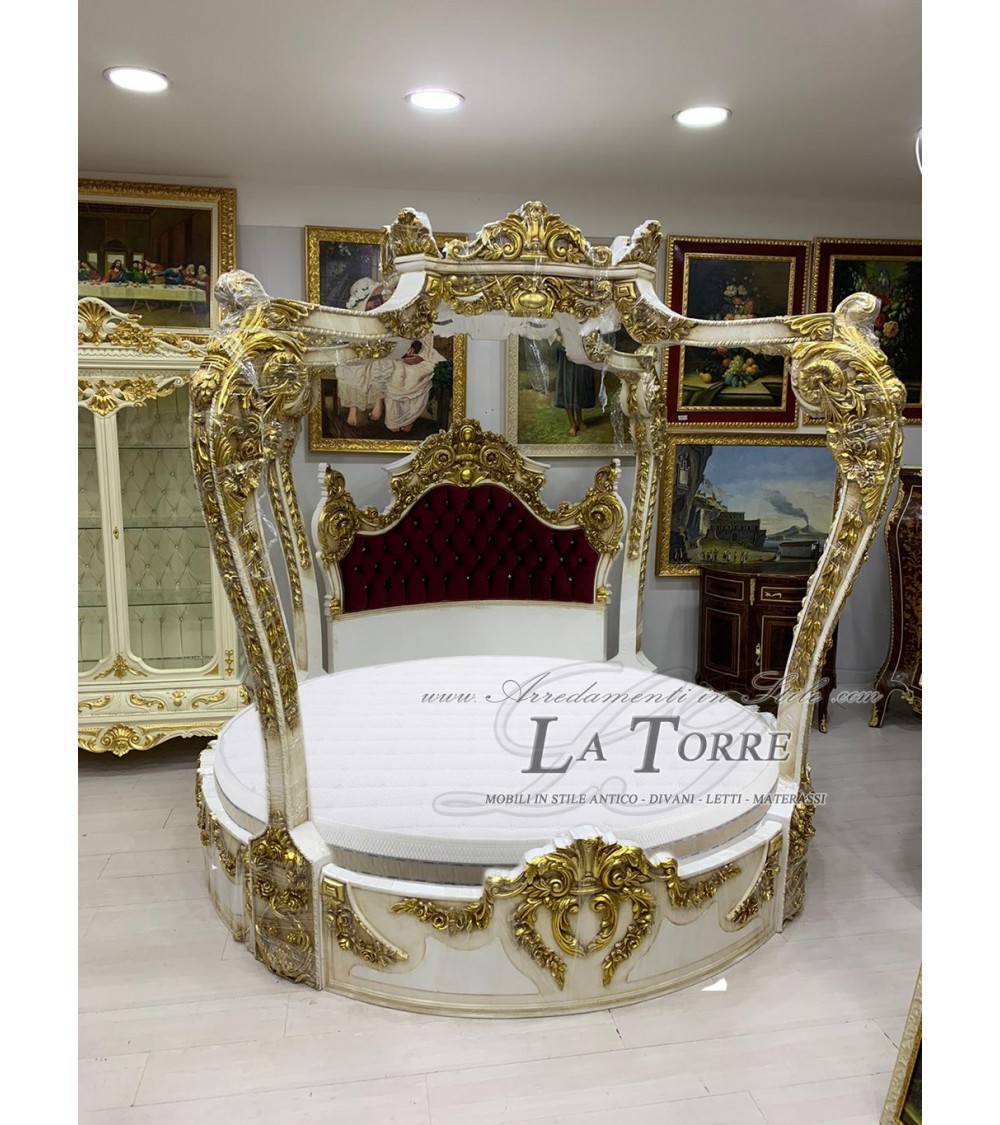 Double bed with round canopy Louis XV Baroque wood ivory gold velvet LT2680