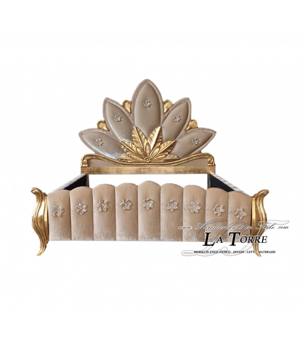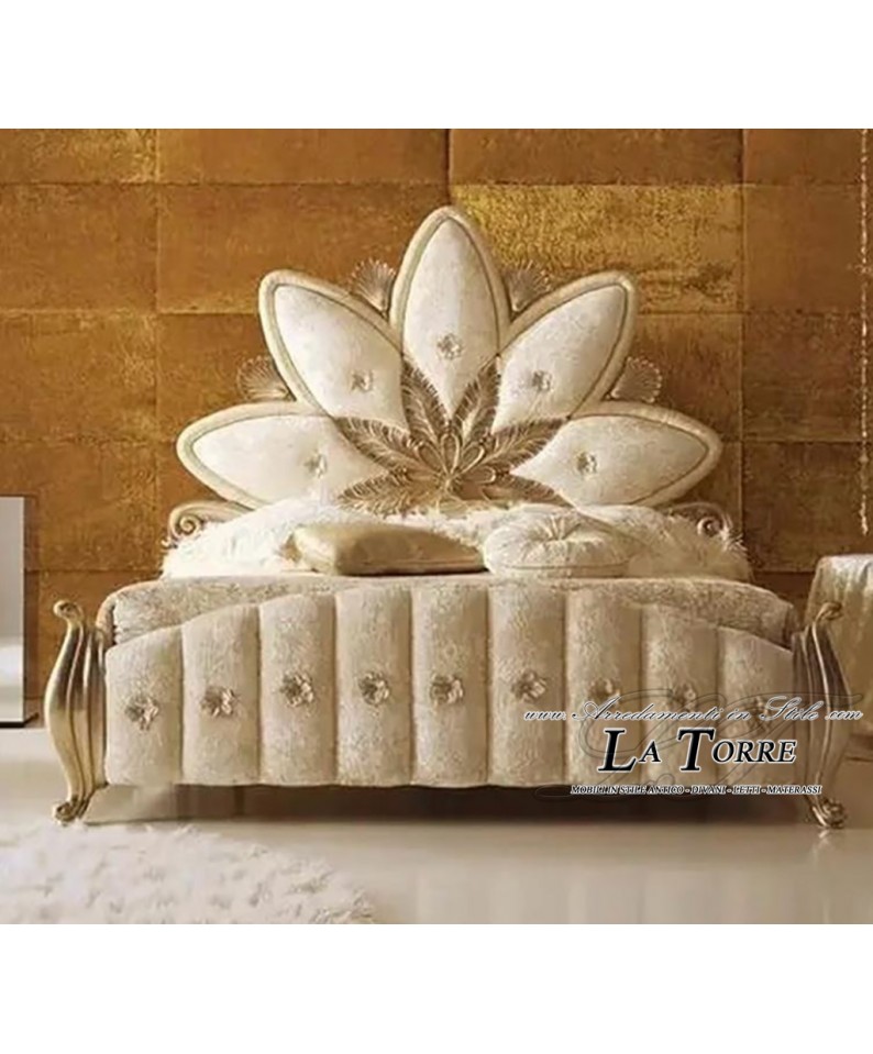Double bed with a high and imposing headboard is the real protagonist, characterized by a unique design in the shape of a stylized flower or radiant sun, padded in a refined cream-colored fabric with delicate stitching that defines the petals. A precious central golden insert with ornamental motifs adds a touch of pomp and refinement.