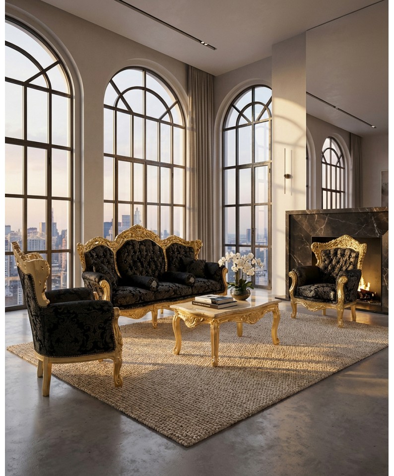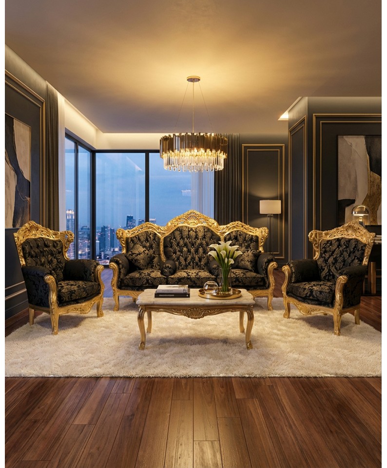 The seats and backrests are upholstered in refined black lily damask fabric , a deep and sophisticated shade that creates a bold and prestigious contrast with the gold frame. The capitonné workmanship enhances the sofa and armchairs with an elegant quilted effect, enhancing their depth and softness. The hand-sculpted carvings and gold finishes complete an opulent and distinctive aesthetic.