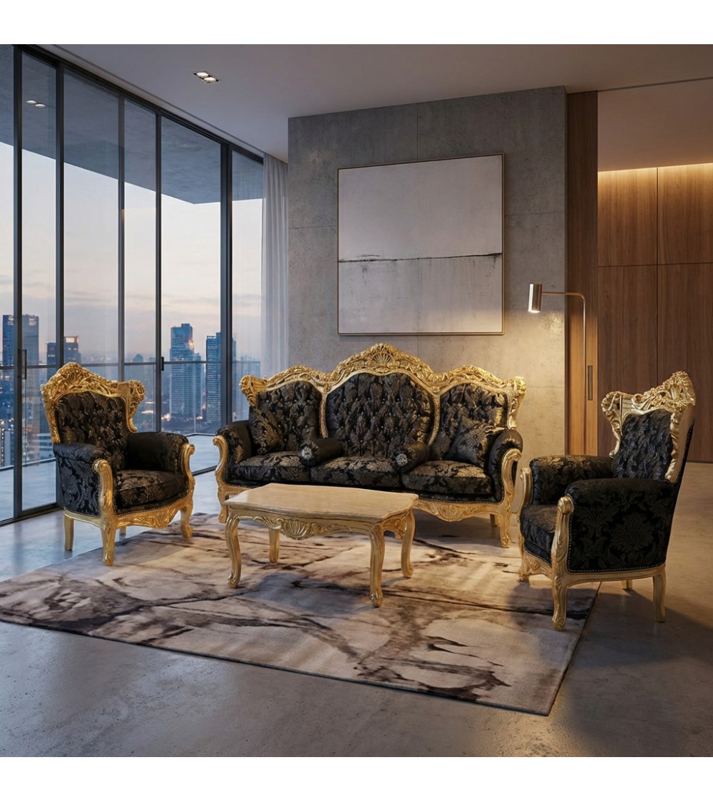 The contoured armrests and finely crafted curved legs add further elegance to the set. The matching coffee table, with its gold leaf frame and elegant top, blends perfectly with the living room, providing both functionality and a magnificent decorative element.