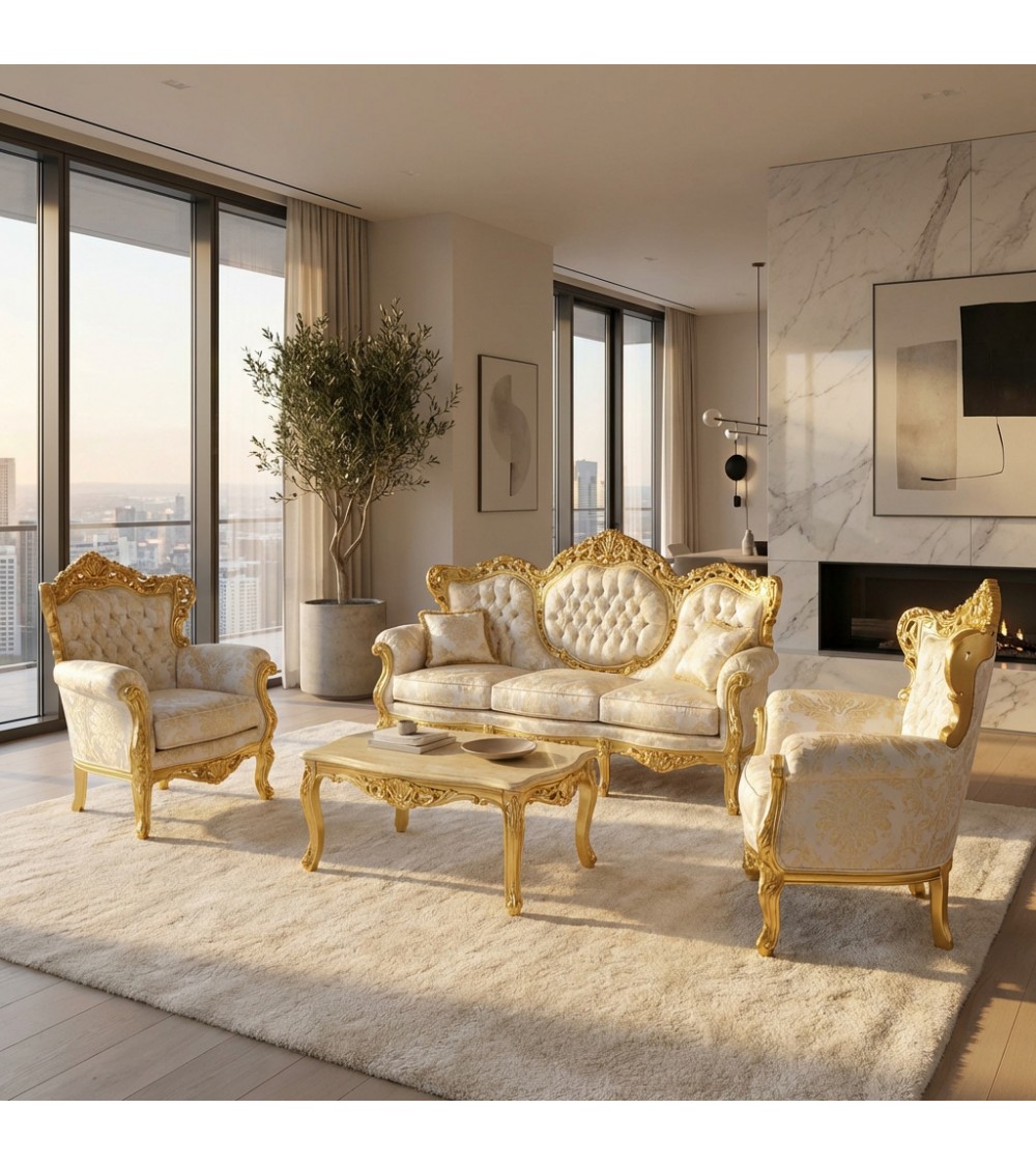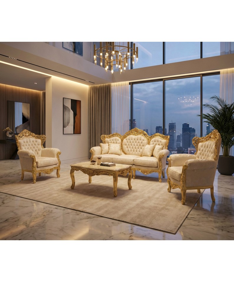 The seats and backrests are upholstered in refined ivory lily damask fabric , a luminous and sophisticated shade that creates a harmonious contrast with the golden frame. The capitonné workmanship enhances the sofa and armchairs with an elegant quilted effect, while the hand-sculpted gold carvings further enhance the opulent aesthetic of the set.