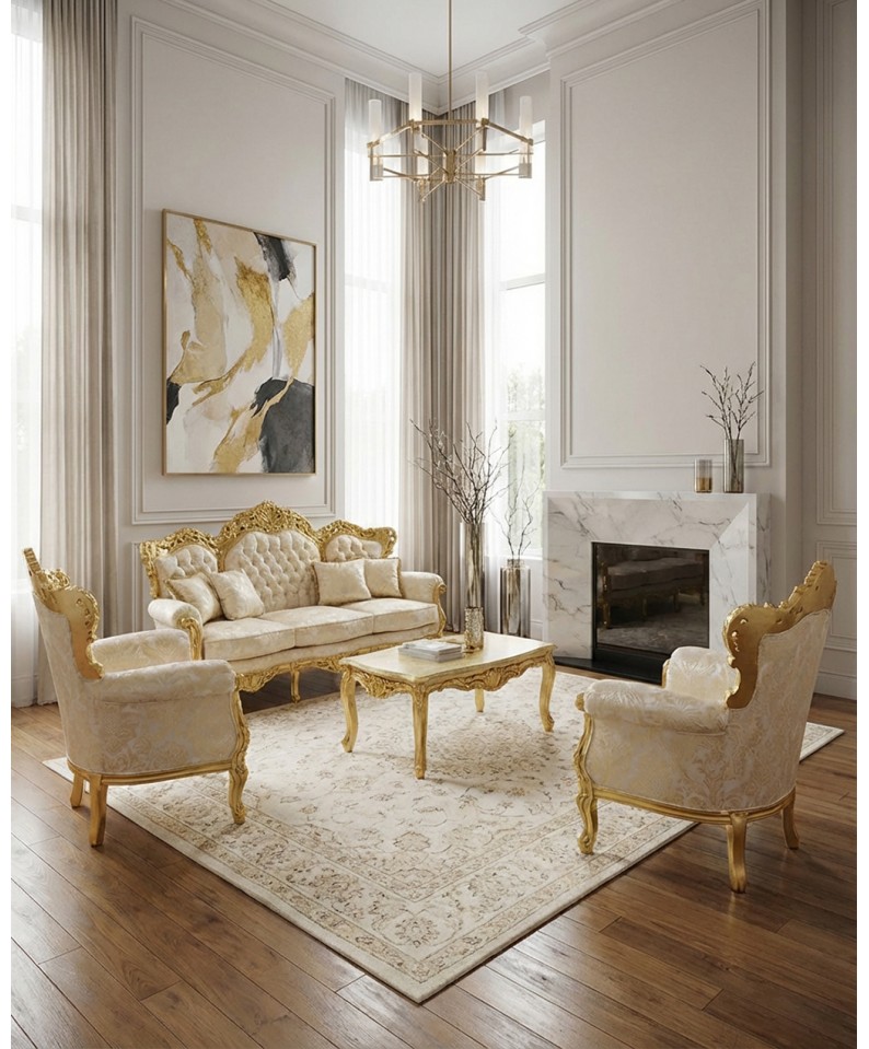 The Germany Baroque Living Room is an authentic masterpiece of classical elegance, handcrafted with a solid, finely carved wooden structure and finished in precious shiny gold leaf .