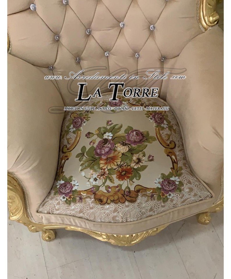 The golden structure enhances the sinuous baroque scrolls and hand-sculpted floral details, creating a regal and luminous effect. The padding is covered in dove gray velvet with central seats embellished with elegant floral fabric , a sophisticated combination that gives personality and refinement to the room.