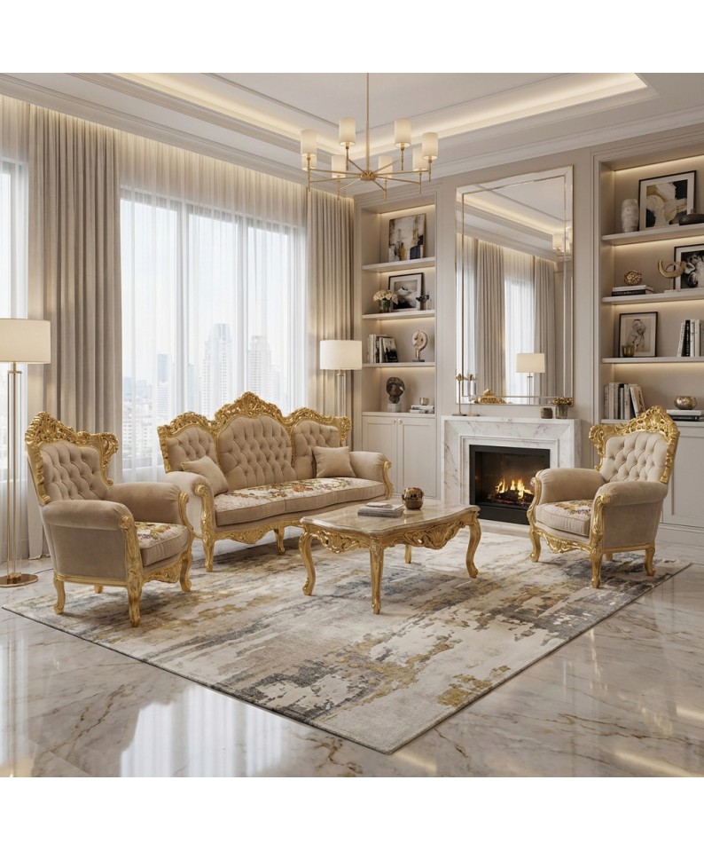 Elegant and dramatic Baroque living room set Germany AL1242 , handcrafted from solid wood with refined decorative carvings and a gold leaf finish. A visually striking set that combines luxury, tradition, and comfort, perfect for classic settings, reception rooms, and elegant spaces.