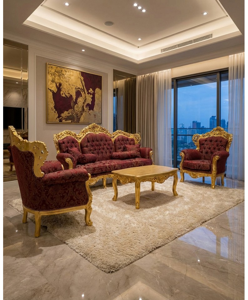 The seats and backrests are upholstered in a refined burgundy lily damask fabric , a deep, warm, and sophisticated shade that lends character and prestige to the room, creating a rich and harmonious contrast with the golden frame. The capitonné workmanship enhances the sofa and armchairs with an elegant quilted effect, enhancing their depth and softness. The hand-sculpted carvings and gold leaf finishes complete an opulent and distinctive aesthetic.