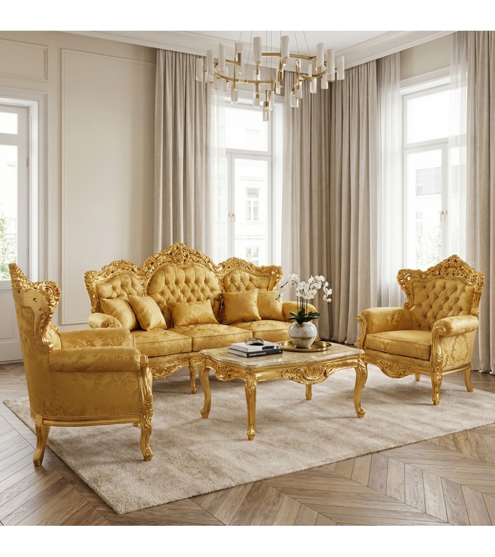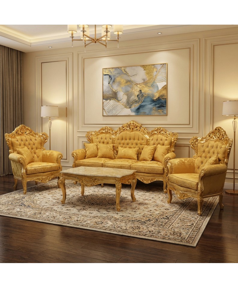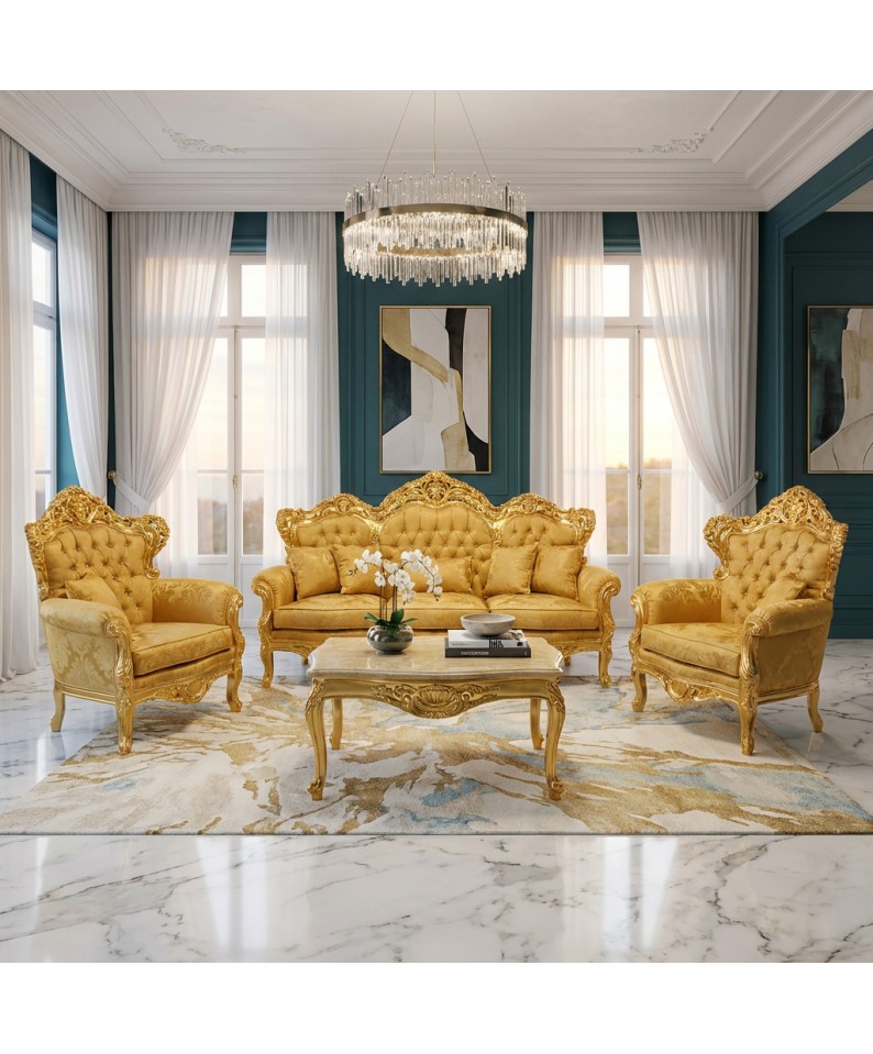 The sculpted armrests and finely crafted curved legs complete the set's majestic aesthetic. The matching coffee table, with its gold leaf frame and elegant top, integrates perfectly with the living room, providing both functionality and a striking decorative element.