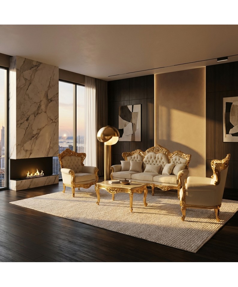 The ivory faux leather upholstery adds brightness and refinement, creating an elegant contrast with the golden frame. The seats and backrests are embellished with fine capitonné workmanship , with jeweled buttons that catch the light and enhance the entire living room's dramatic effect.
