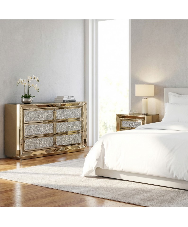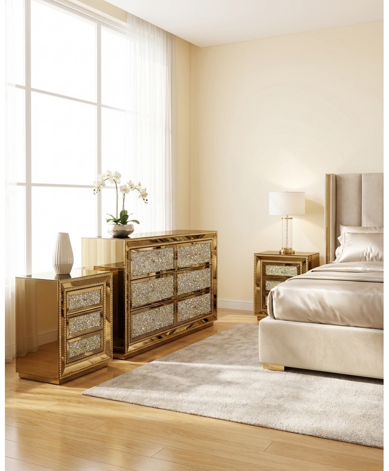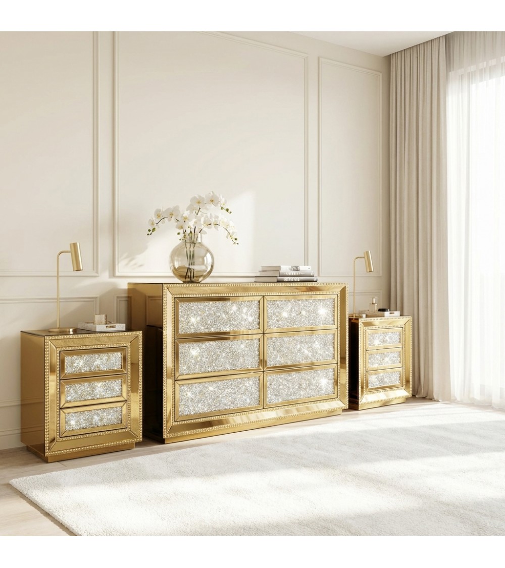 The CBFD16FMB set consists of a dresser and two gold-colored mirrored nightstands , embellished with Swarovski crystals set into the drawer fronts. Each piece reflects light with a brilliant and sophisticated effect, adding brightness and prestige to the bedroom.