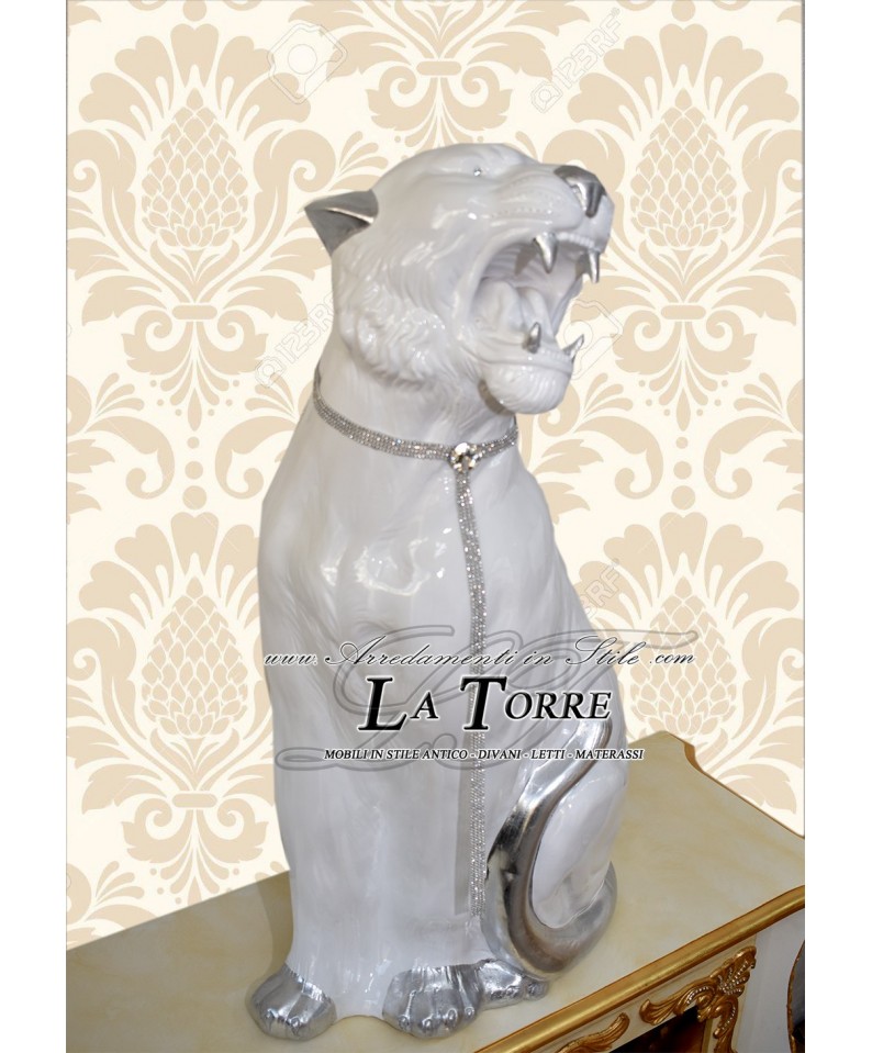 Ceramic statue sculpture Tiger open mouth Tiger white silver swarovski 90 cm