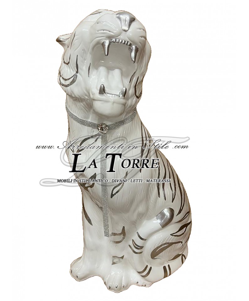 Ceramic statue sculpture Tiger open mouth Tiger white silver swarovski 90 cm