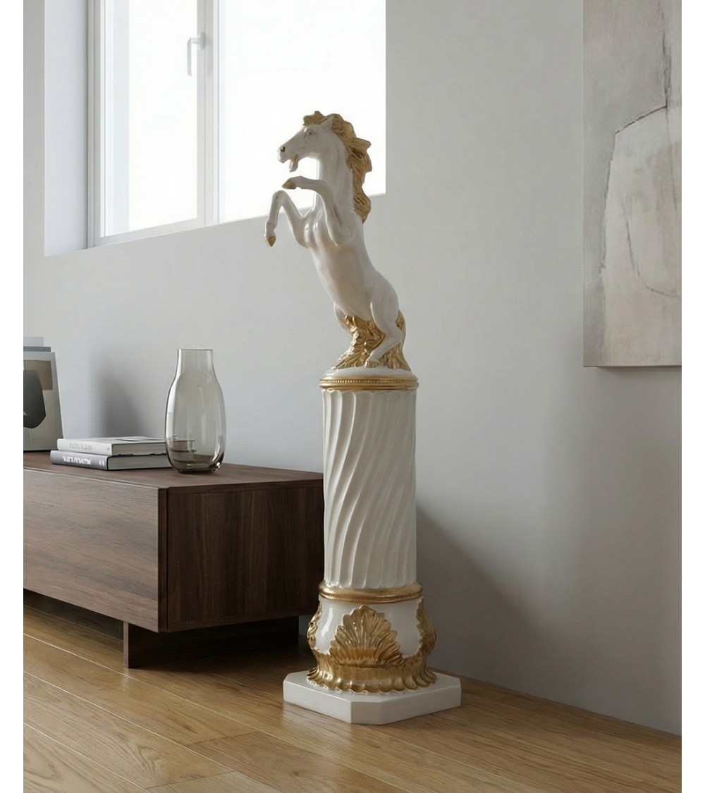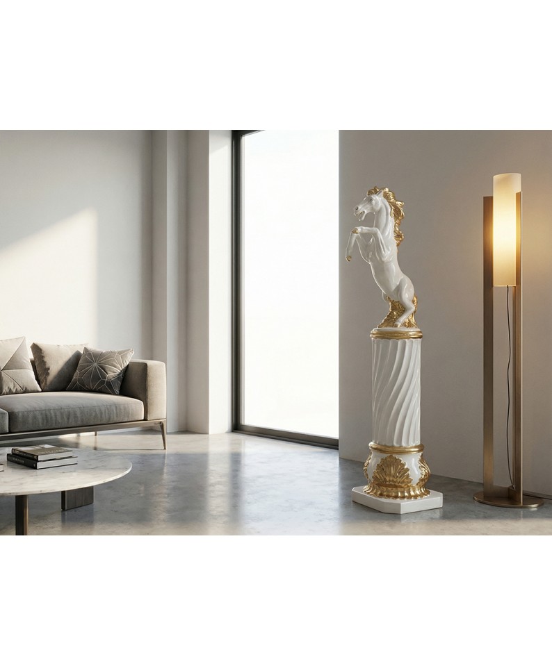 Ceramic sculpture statue of a prancing horse on an ivory and gold column H115 PR61