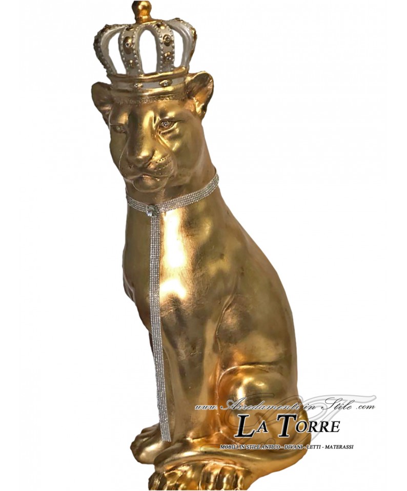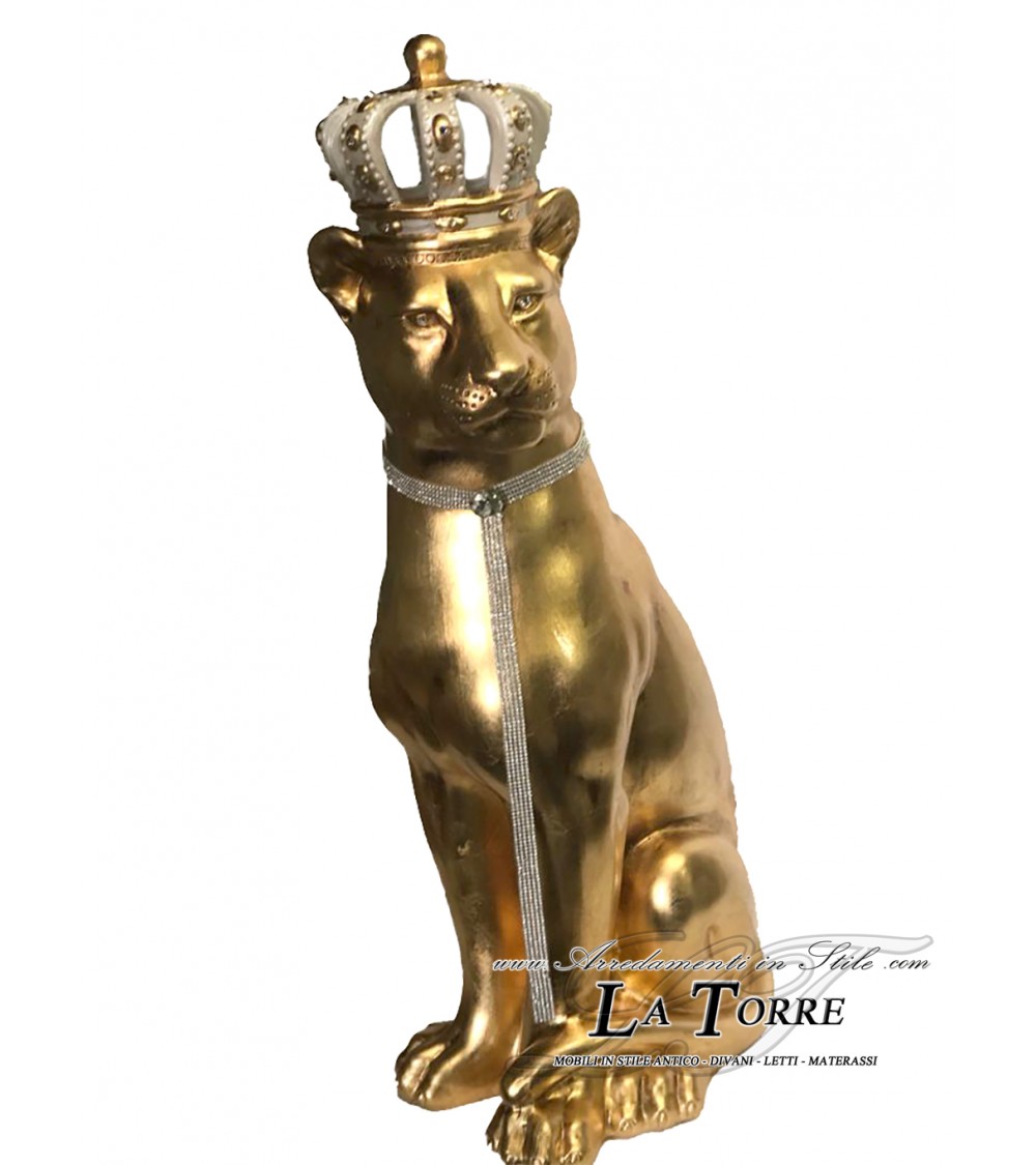 Ceramic animals statue sculpture Lioness h100 cm covered in a brilliant gold swarovski finish . The animal is depicted with a composed and regal expression. The sculpture is further embellished with a detailed golden crown placed on the panther's head, which accentuates its sumptuous appearance. Around its neck, the animal wears an elegant collar studded with rhinestones or small sparkling crystals, from which a decorative cascade element, also sparkling, hangs down its chest. The overall design of the sculpture suggests a luxurious piece of furniture, suitable for interiors that aim for an opulent and regal aesthetic.