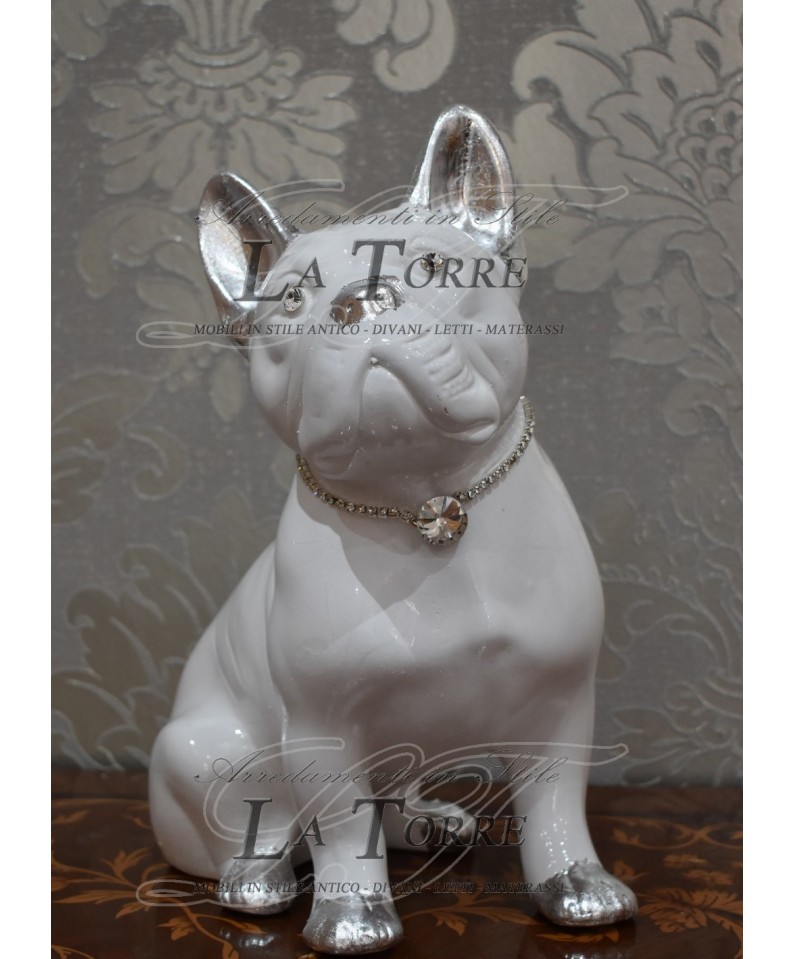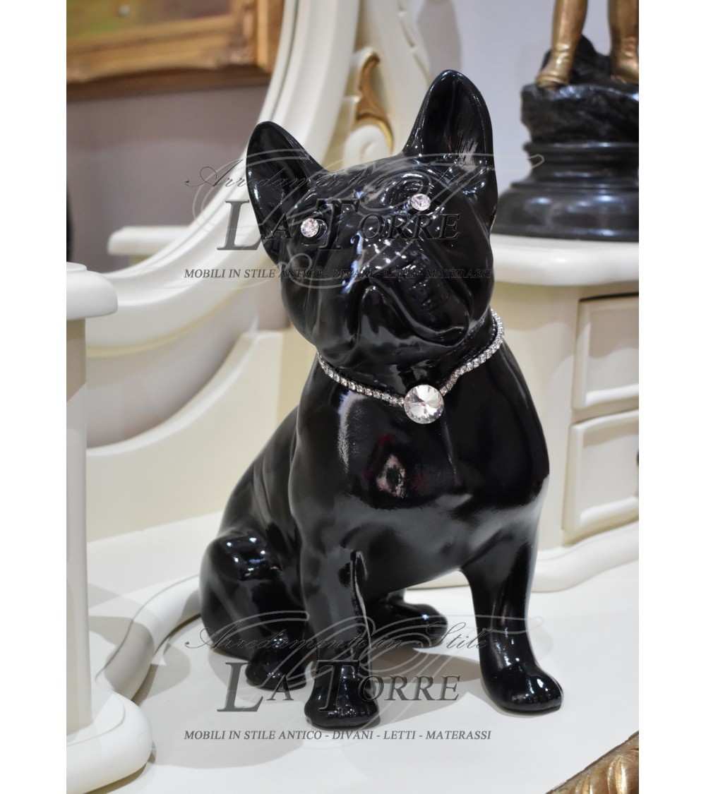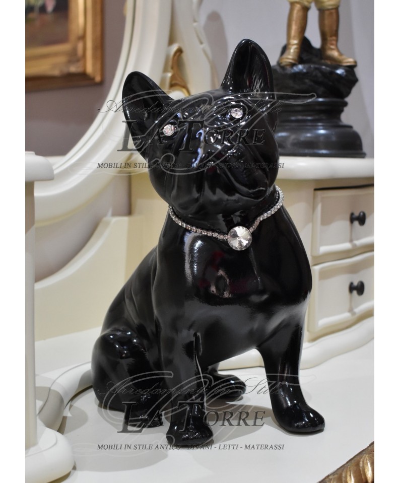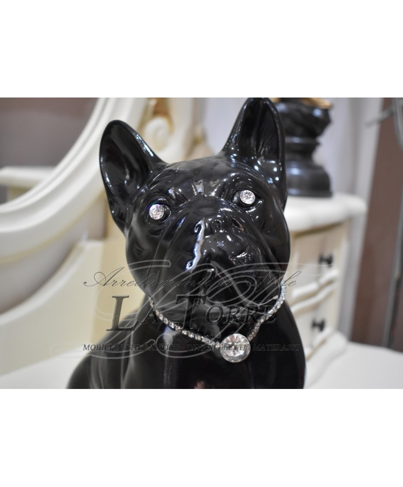 French bulldog puppy sculpture statue black swarovski animals ceramic, glossy black finish that gives it a very chic and modern look. The dog is depicted in a sitting position, with straight ears and an attentive and curious expression. The eyes of the sculpture are embellished with large bright rhinestones, which catch the light and give a touch of sparkle and liveliness. Around the neck, the bulldog wears a showy rhinestone collar, with a larger and round central pendant that serves as an additional focal point of shine. This sculpture is a distinctive decorative element, combining the elegance of glossy black with the sparkle of rhinestones, making it an ideal accessory for interiors with a contemporary or glamorous design. It is perfect for dog lovers, especially French bulldogs, who want to add a touch of personality and luxury to their decor.