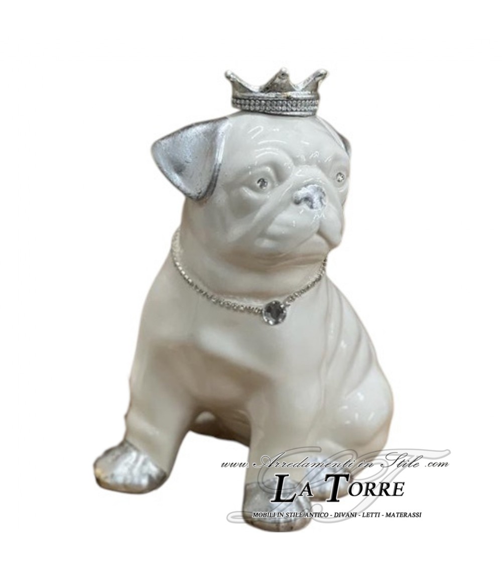 Ceramic pug puppy, characterized by its expressive face and typical wrinkles, sitting in a regal pose, with a pearly white finish that enhances the softness of its shapes. What makes this pug a truly unique object are the sumptuous details. The paws are silver, as are the inside of the ears, adding a touch of opulence. The pug's eyes sparkle thanks to small rhinestones set in them, giving it a vivid and friendly look. The final and most distinctive touch is the small silver crown, elegantly positioned on its head. The crown is embellished with a row of sparkling rhinestones that follow its edge, attracting light and attention. Around its neck, the pug wears a thin silver necklace with a single larger rhinestone in the center, which further accentuates its regal appearance.