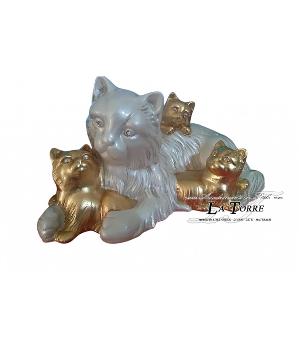 Persian mother cat in ceramic affectionately surrounded by her kittens, with a glossy white main finish and gold details that create an elegant and modern contrast. The mother cat is immaculate white, with a delicate muzzle and ears embellished with gold details. Around her neck she wears a thin gold necklace with a small rhinestone, which adds a touch of delicacy and value. Her three kittens are entirely gold and are positioned around her in dynamic and playful poses, one on the mother's back and two on her sides, simulating a moment of feline family life. This statue is a decorative piece with a great emotional impact, ideal for cat lovers and for those who want to add an element of sweetness, affection and refinement to their environment. It would be perfect as an ornament in a living room, a bedroom, a children's room, or on a shelf, attracting admiring glances.