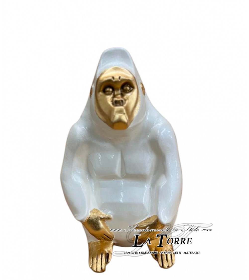 This is a decorative statue depicting a sitting gorilla. The statue has a glossy pearly white finish, while the face, hands and feet are finished in shiny gold leaf, and its eyes are embellished with small shiny rhinestones. It is a graceful and luxurious piece of furniture, which fits perfectly into the collection.