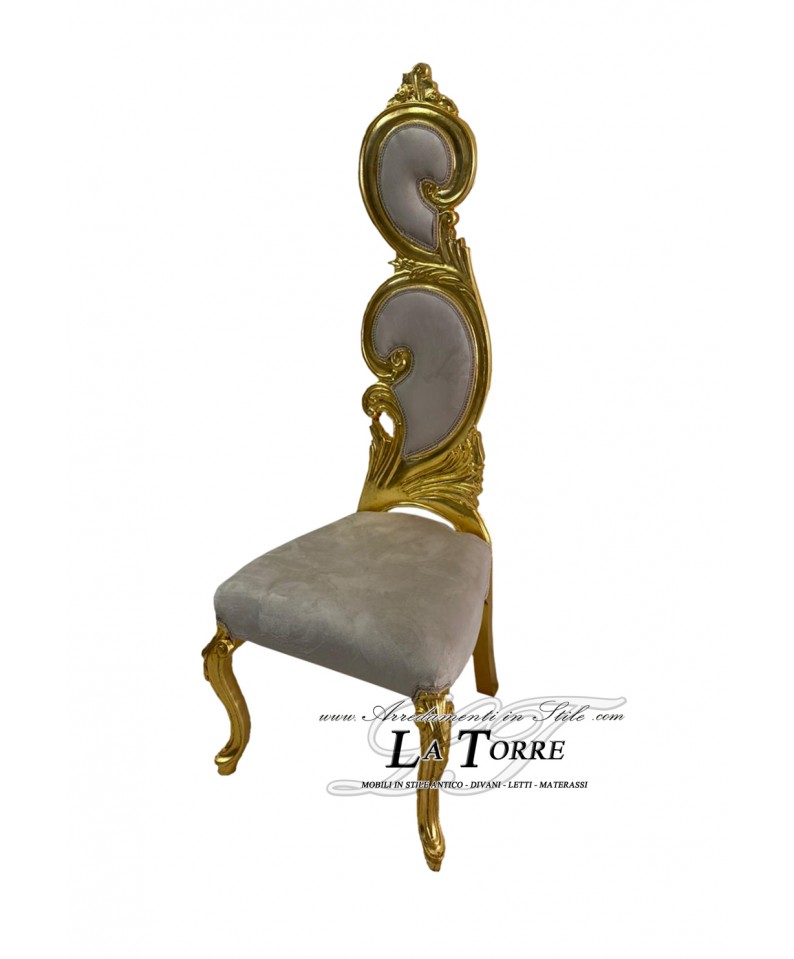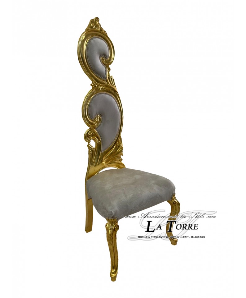 Sumptuous throne chair in baroque style, characterized by a high backrest richly carved with gilded scrolls and a polished finish. The upholstery of the backrest and seat is in a dove grey velvet, which contrasts elegantly with the gold leaf structure. The legs of the chair are also carved with curved motifs and finished in gold, contributing to the regal and opulent appearance.