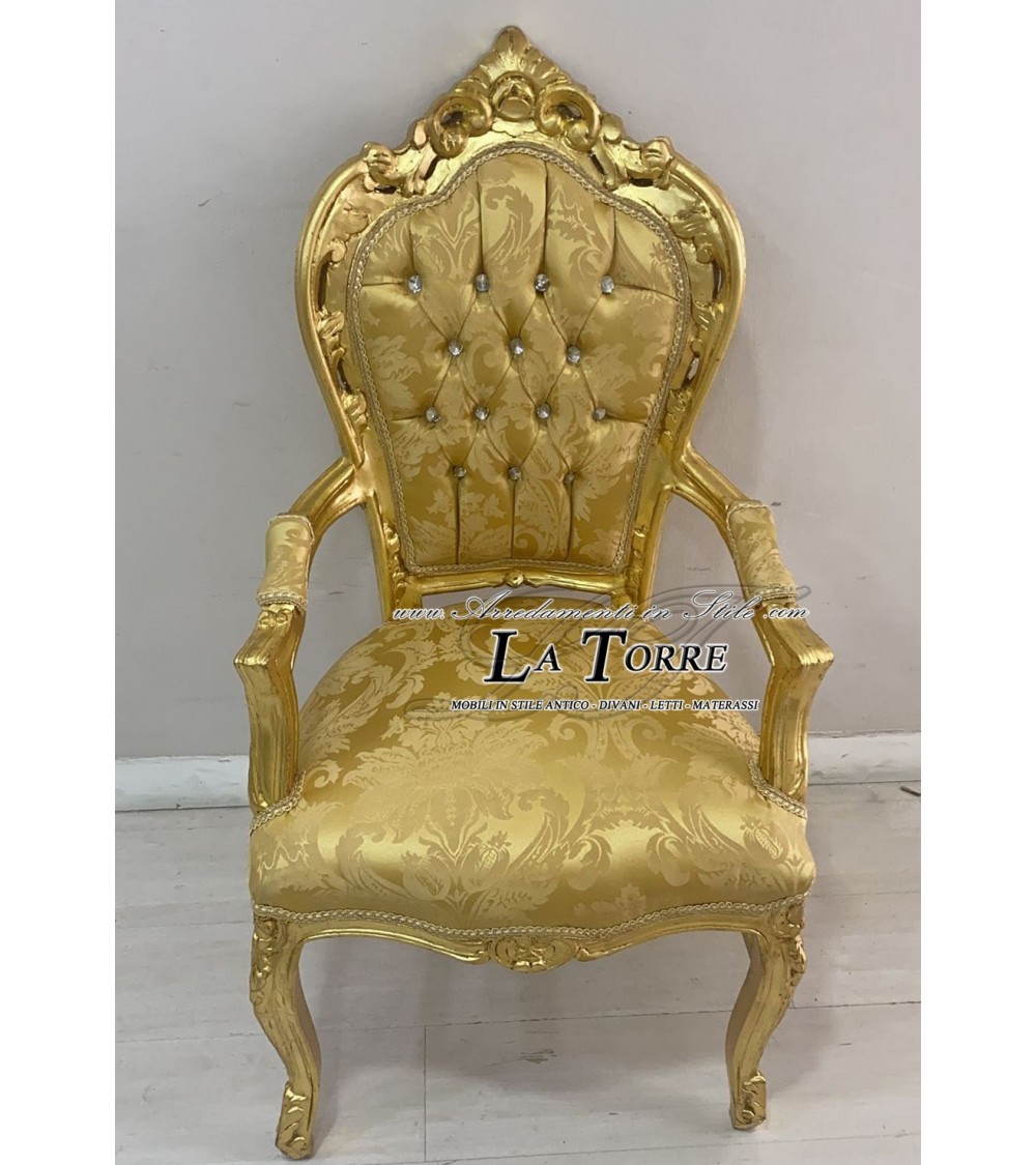 Still armchair chair, with a structure made of fine wood, in gold leaf, expertly carved with curvilinear motifs that enhance its regal shape. The backrest and seat are padded and covered in gold damask fabric with a capitonné workmanship on the backrest that adds depth and refinement. The armrests are padded and covered in the same fabric, the visible buttons on the backrest are not simple studs, but Swarovski that capture the light, giving a further element of luxury. The details, finely applied on the curves of the backrest and on the upper part of the front legs, further enrich the design, creating a captivating visual contrast with the gold leaf wood and gold damask fabric.