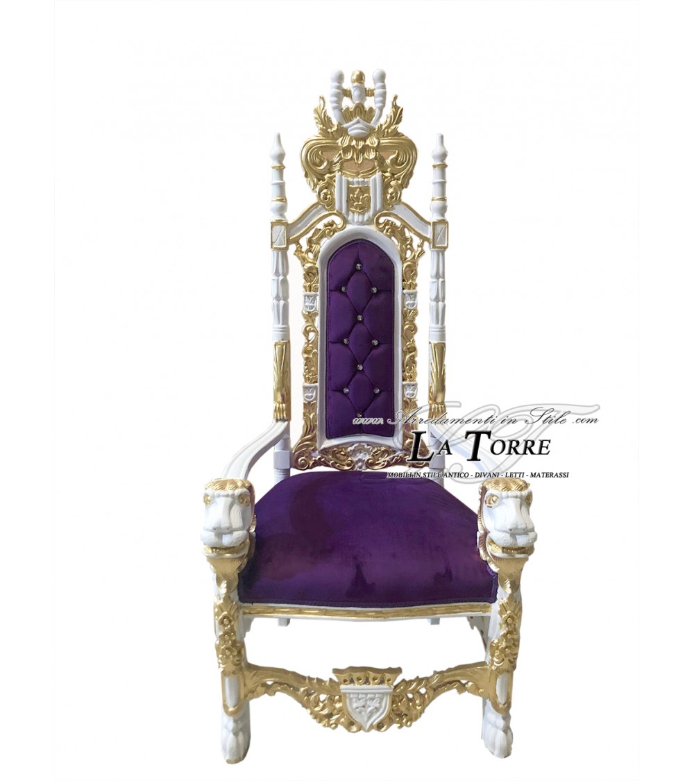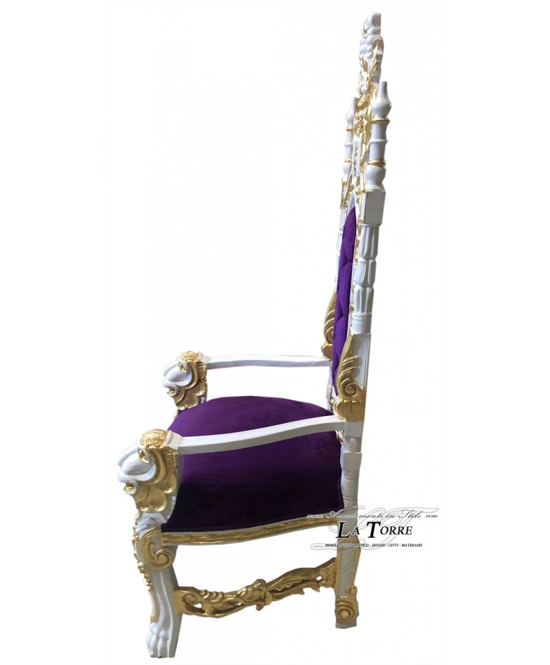 King's throne with lions in baroque style high royal armchair white leaf gold details purple velvet AL10