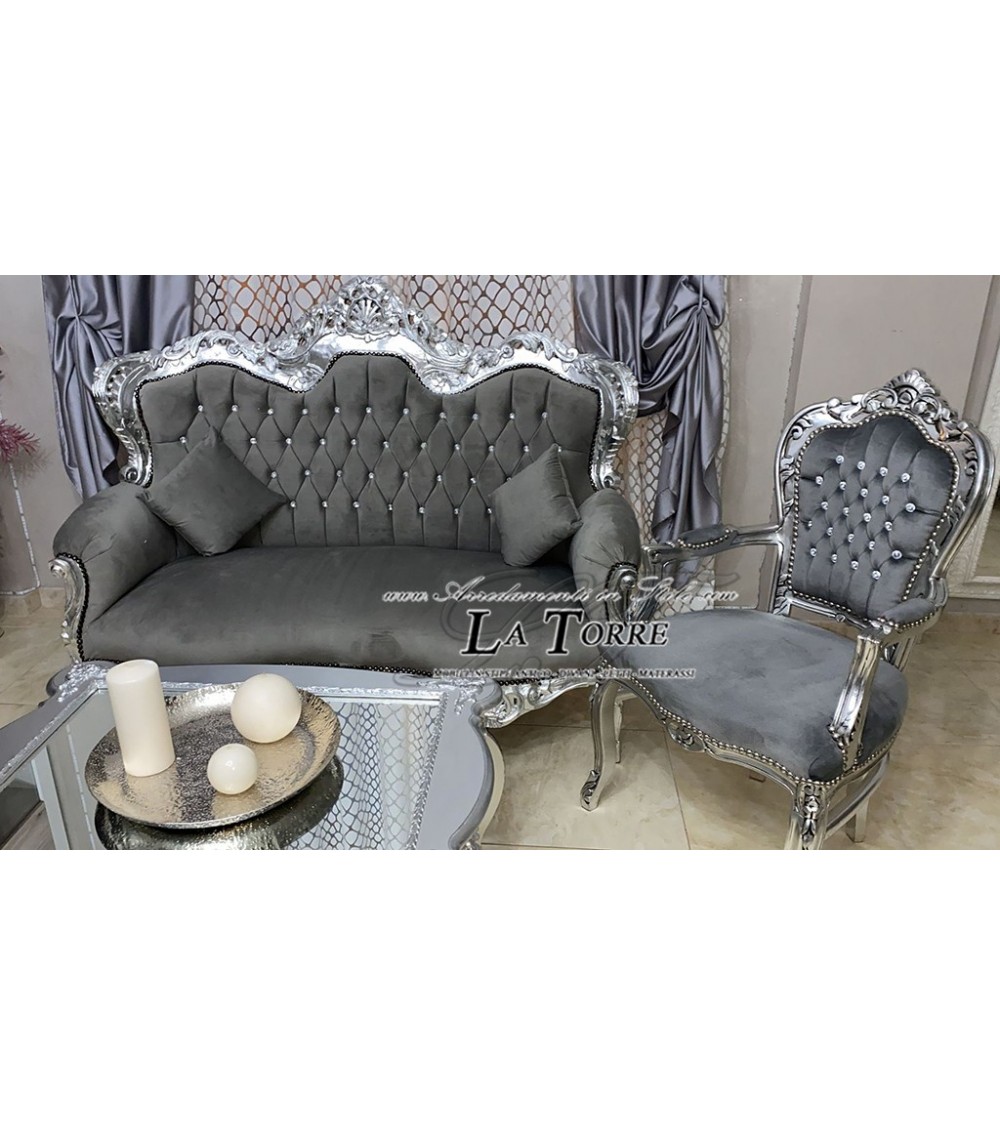 Sofa Armchair Germany Living Room Silver Leaf Baroque Solid Wood Grey Velvet MA0104