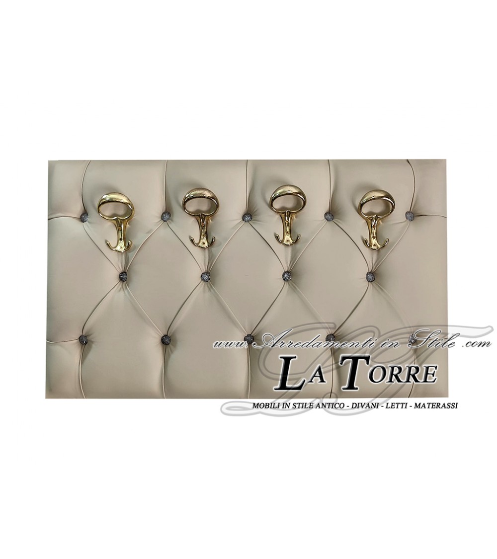 A baroque style wall coat rack stands out for its luxurious and decorative design. The structure is entirely covered in quilted ivory eco-leather, with a capitonné workmanship that creates a diamond pattern, adding a touch of elegance and texture.