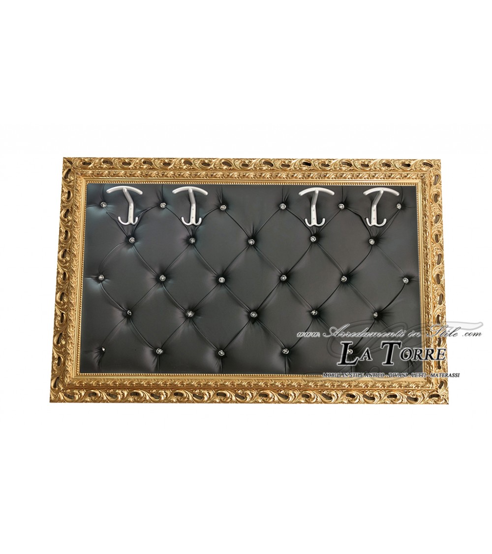 A baroque style wall coat rack stands out for its luxurious and decorative design. The structure is entirely covered in black quilted eco-leather, with a capitonné workmanship that creates a diamond pattern, adding a touch of elegance and texture.