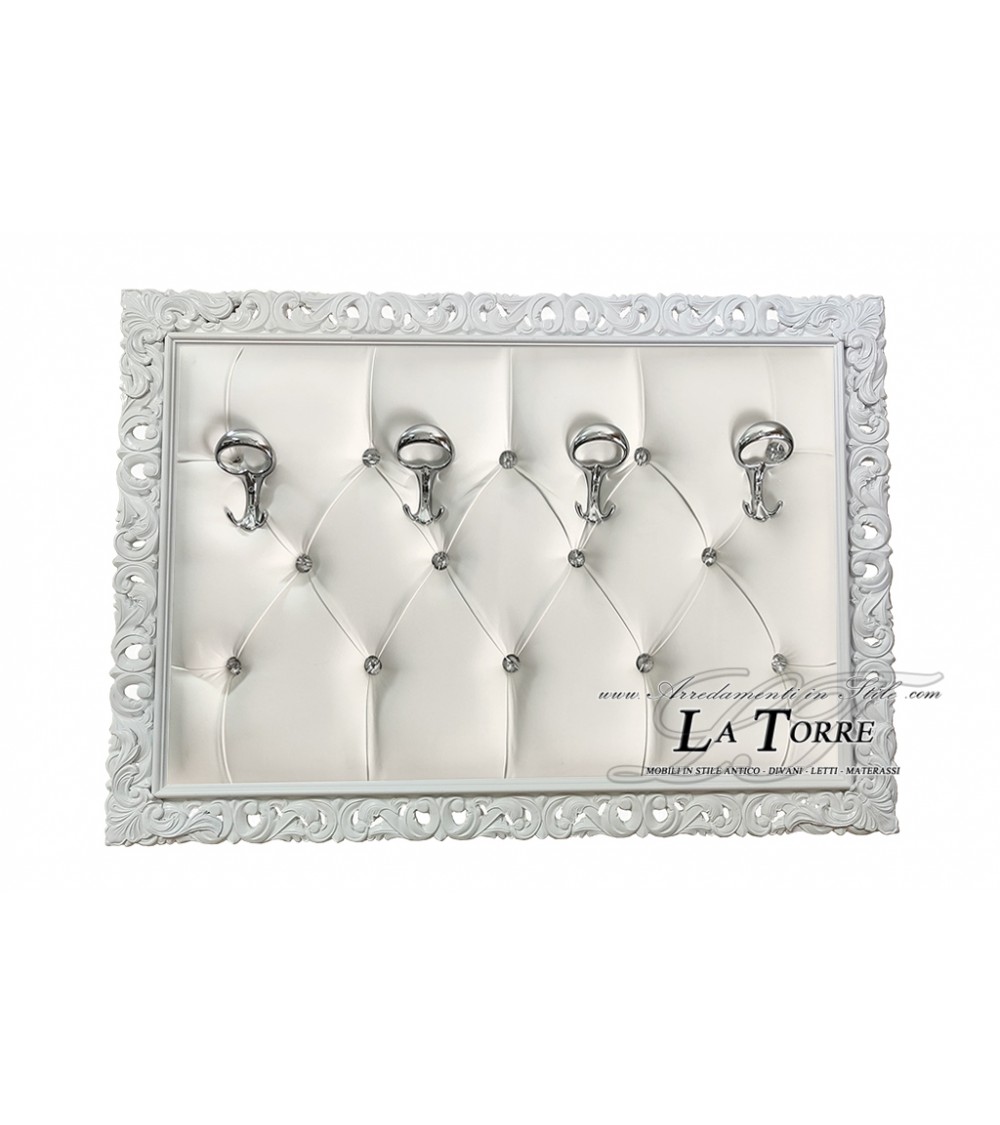 A baroque style wall coat rack stands out for its luxurious and decorative design. The structure is entirely covered in white quilted fabric, with a capitonné workmanship that creates a diamond pattern, adding a touch of elegance and texture.