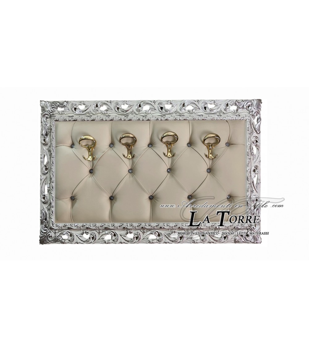 The coat rack frame is made of white leaf wood with silver details, with elaborate carvings and floral decorations that recall the baroque style. Four golden metal hooks, with a curl shape, are fixed on the top of the coat rack, providing space for hanging coats, scarves or other accessories.