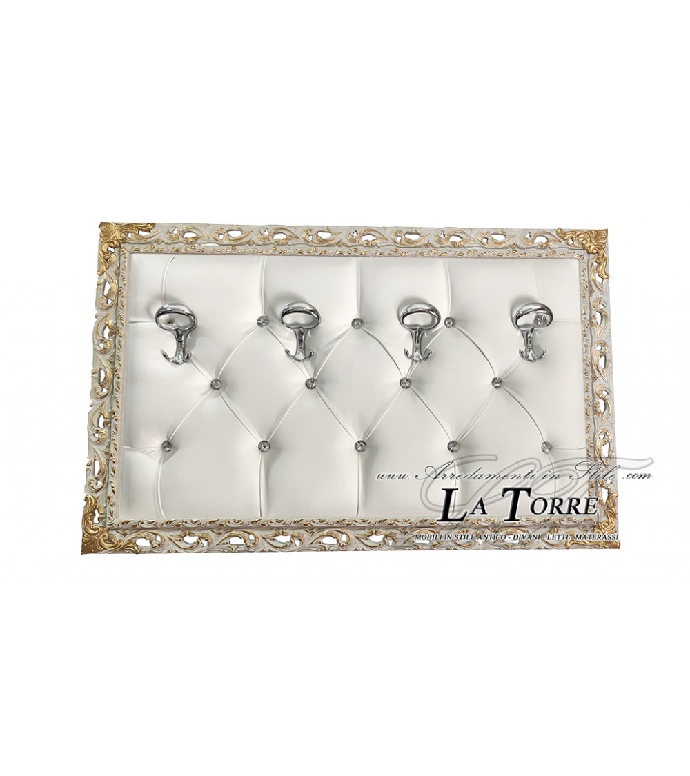 Baroque style wall coat rack stands out for its luxurious and decorative design. The structure is entirely covered in quilted white eco-leather, with a capitonné workmanship that creates a diamond pattern, adding a touch of elegance and texture.