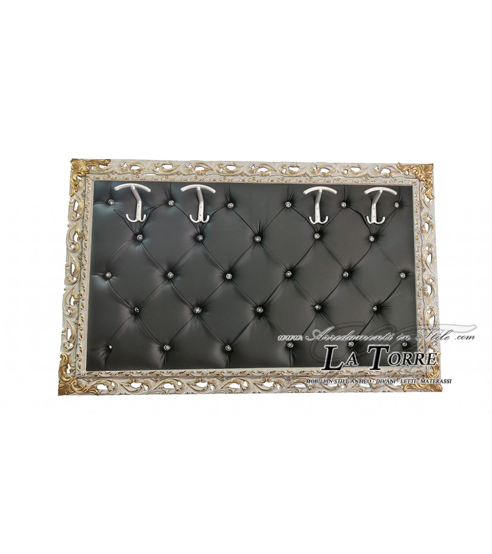 Baroque style wall coat rack stands out for its luxurious and decorative design. The structure is entirely covered in black quilted eco-leather, with a capitonné workmanship that creates a diamond pattern, adding a touch of elegance and texture.