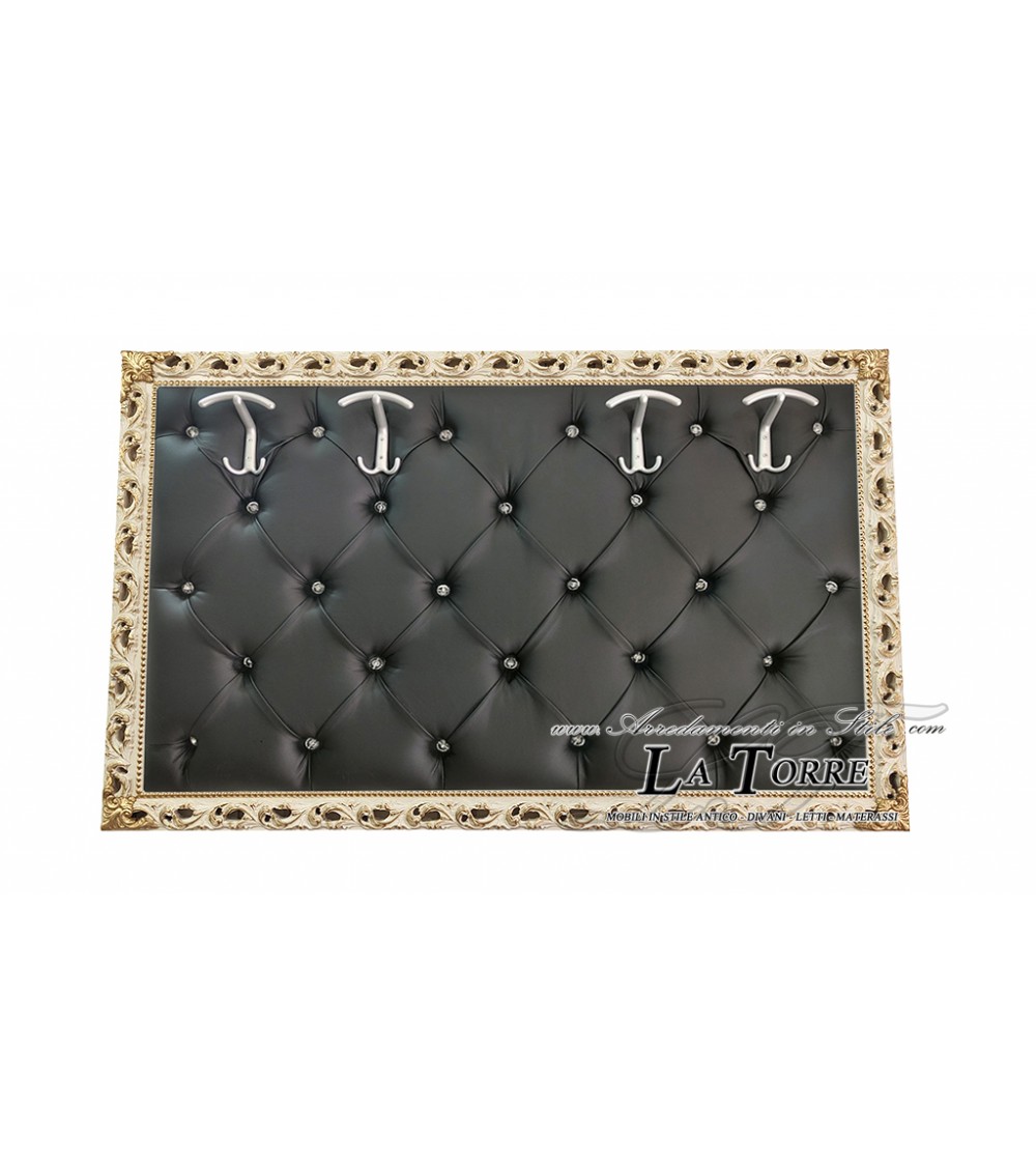 Baroque style wall coat rack stands out for its luxurious and decorative design. The structure is entirely covered in black quilted eco-leather, with a capitonné workmanship that creates a diamond pattern, adding a touch of elegance and texture.