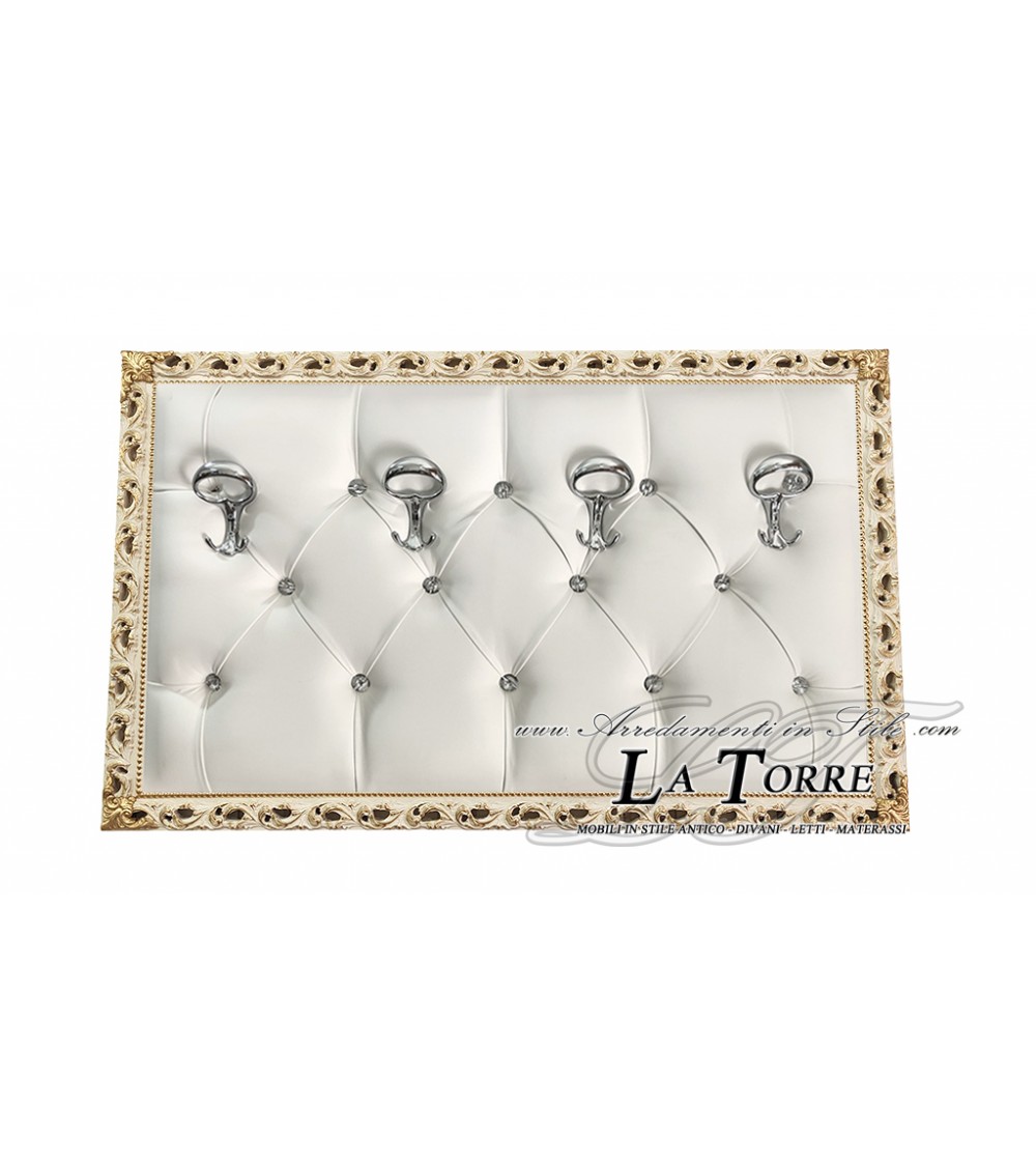 Baroque style wall coat rack stands out for its luxurious and decorative design. The structure is entirely covered in quilted white eco-leather, with a capitonné workmanship that creates a diamond pattern, adding a touch of elegance and texture.