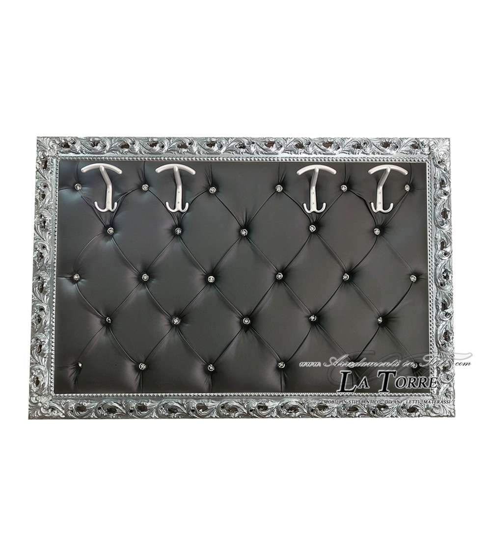 Baroque style wall coat rack stands out for its luxurious and decorative design. The structure is entirely covered in black quilted eco-leather, with a capitonné workmanship that creates a diamond pattern, adding a touch of elegance and texture.