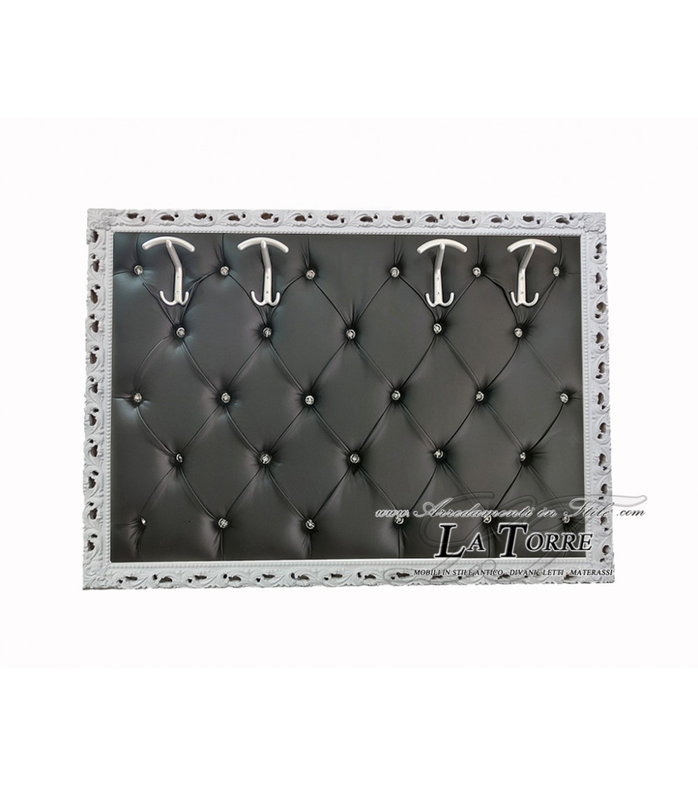 Baroque style wall coat rack stands out for its luxurious and decorative design. The structure is entirely covered in black quilted eco-leather, with a capitonné workmanship that creates a diamond pattern, adding a touch of elegance and texture.