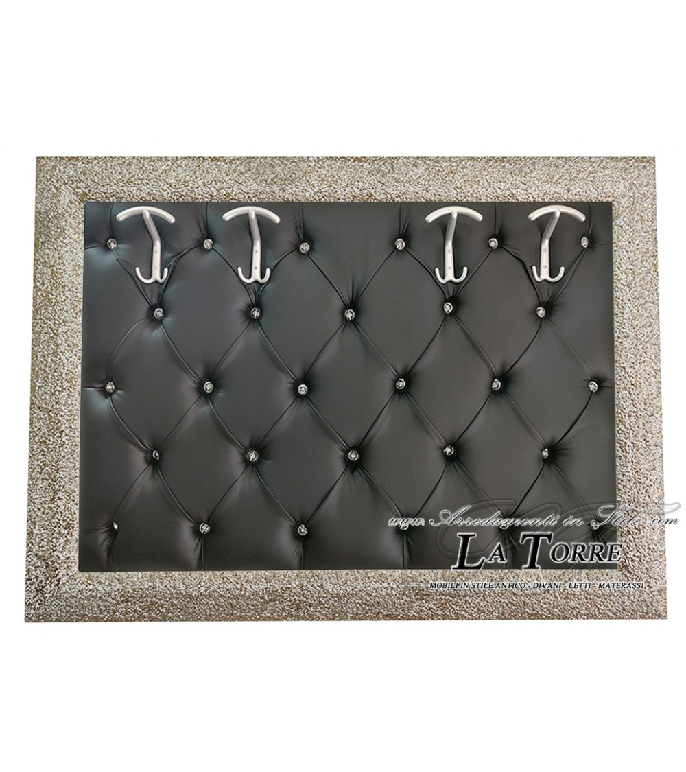 Baroque style wall coat rack features a refined and functional design. The base is covered in a soft black eco-leather fabric, with a classic capitonné workmanship that creates a diamond pattern, embellished with buttons that add a touch of elegance and texture.