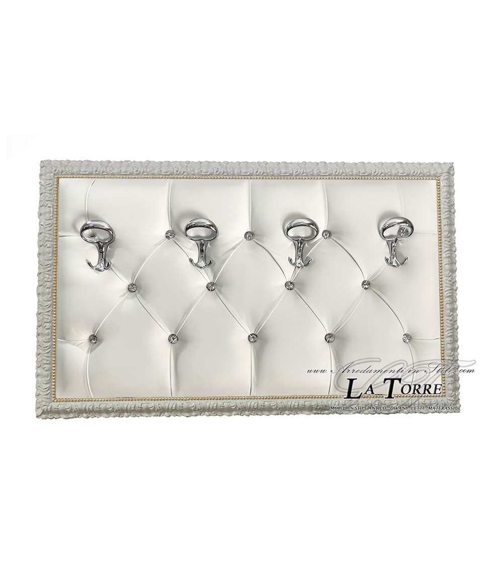 Baroque style wall coat rack features a sophisticated and functional design. The base is covered in quilted white eco-leather, with a classic capitonné workmanship that creates a diamond pattern, embellished with buttons that add a touch of elegance and texture.