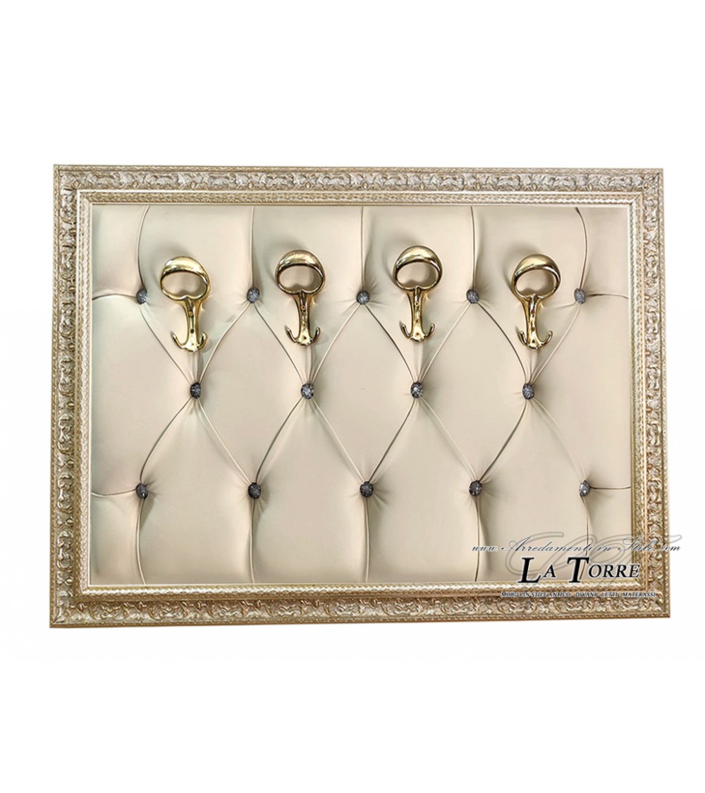A baroque style wall coat rack features a sophisticated and luxurious design. The central panel is covered in black quilted eco-leather, with a classic capitonné workmanship that creates a diamond pattern, embellished with buttons that add a touch of elegance and texture.