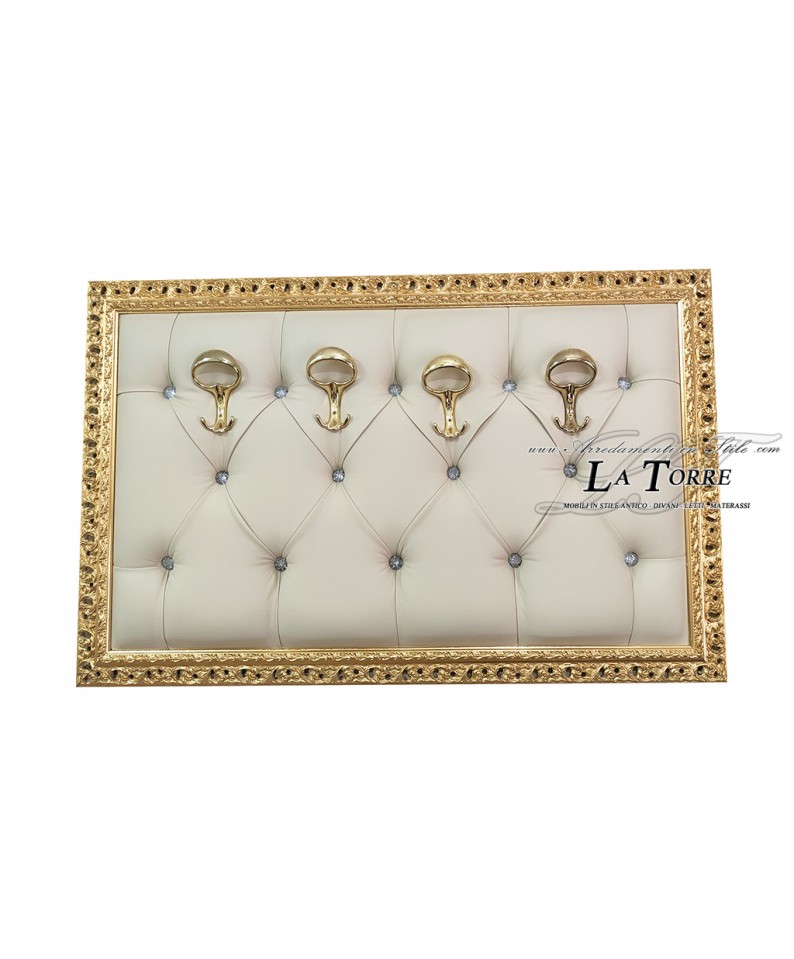 Baroque style wall coat rack features a sophisticated and functional design. The base is covered in black quilted eco-leather, with a classic capitonné workmanship that creates a diamond pattern, embellished with buttons that add a touch of elegance and texture.