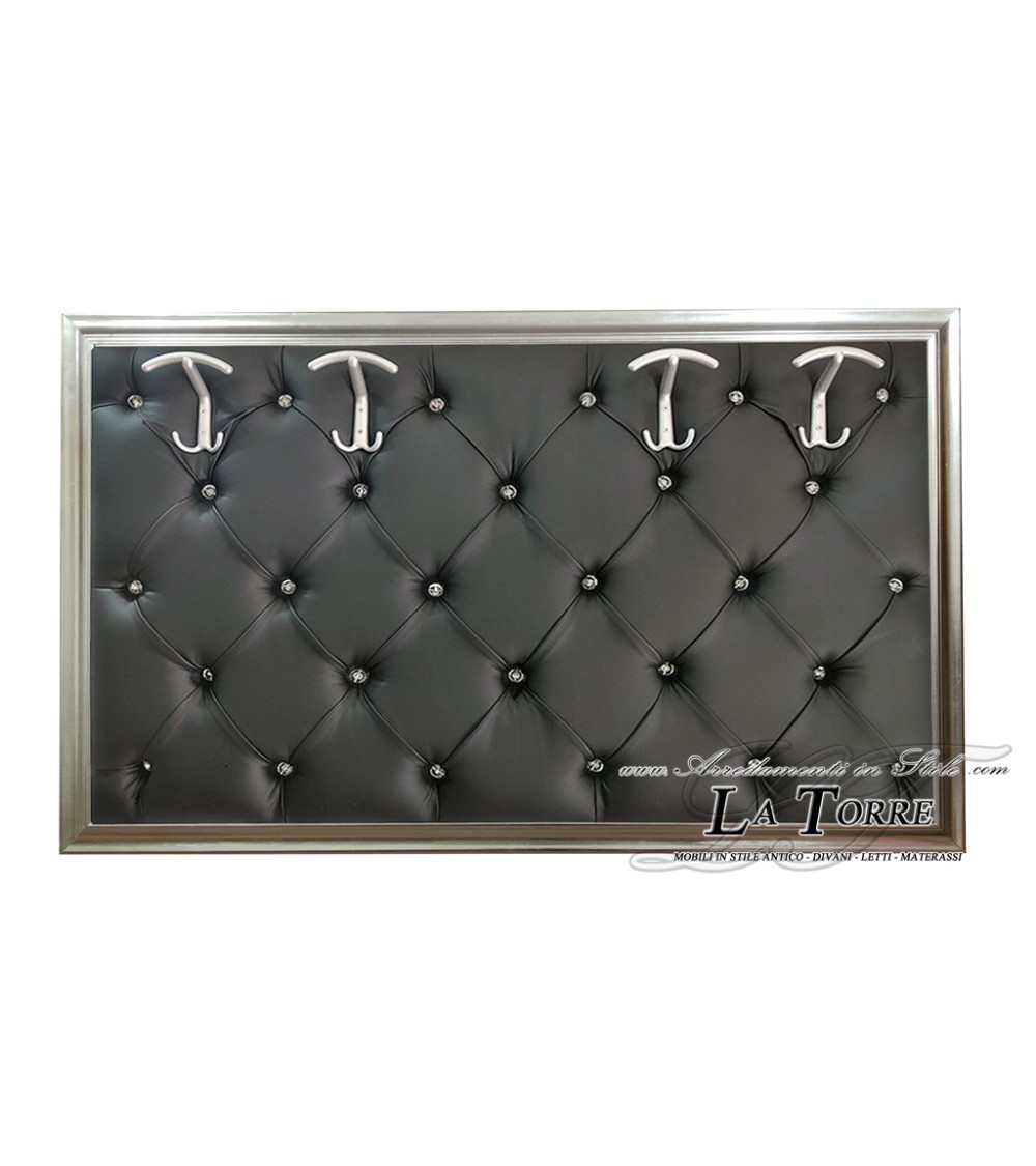 The silver metal hooks are fixed on the top, providing ample space for hanging coats, scarves, bags or other accessories. The frame surrounding the padded panel is in elegant silver leaf, which adds an additional decorative and luxurious element to the ensemble.