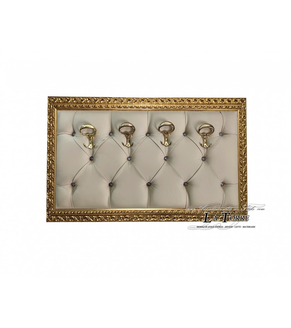 A baroque style wall coat rack stands out for its luxurious and decorative design. The structure is entirely covered in quilted ivory eco-leather, with a capitonné workmanship that creates a diamond pattern, adding a touch of elegance and texture.