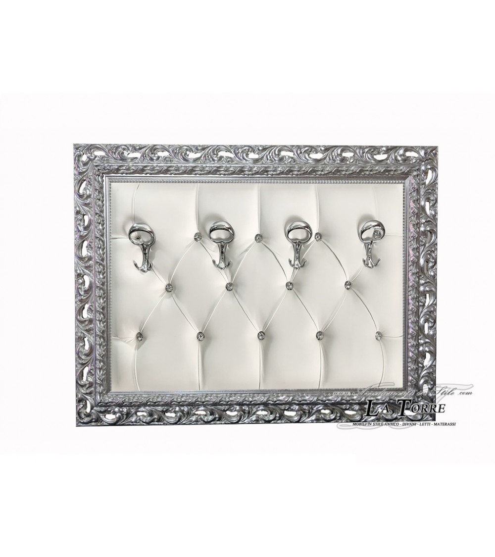 A baroque-style wall coat rack stands out for its luxurious and decorative design. The structure is entirely covered in white quilted fabric, with a capitonné workmanship that creates a diamond pattern, adding a touch of elegance and texture. The frame of the coat rack is made of silver leaf wood, with elaborate carvings and floral decorations that recall the baroque style. Four silver metal hooks, with a curl shape, are fixed on the upper part of the coat rack, providing space for hanging coats, scarves or other accessories. The capitonné workmanship creates a three-dimensional effect, adding an additional element of detail and texture.