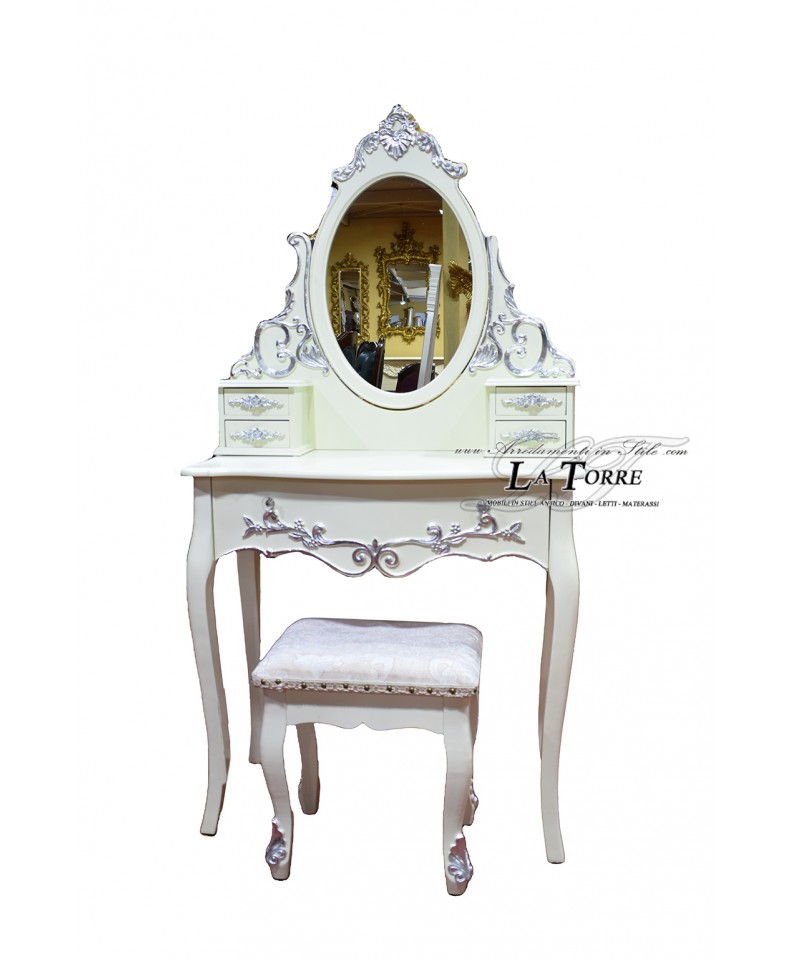 Dressing table, dressing table, mirror, baroque style pouf, white and silver ballerina Na41