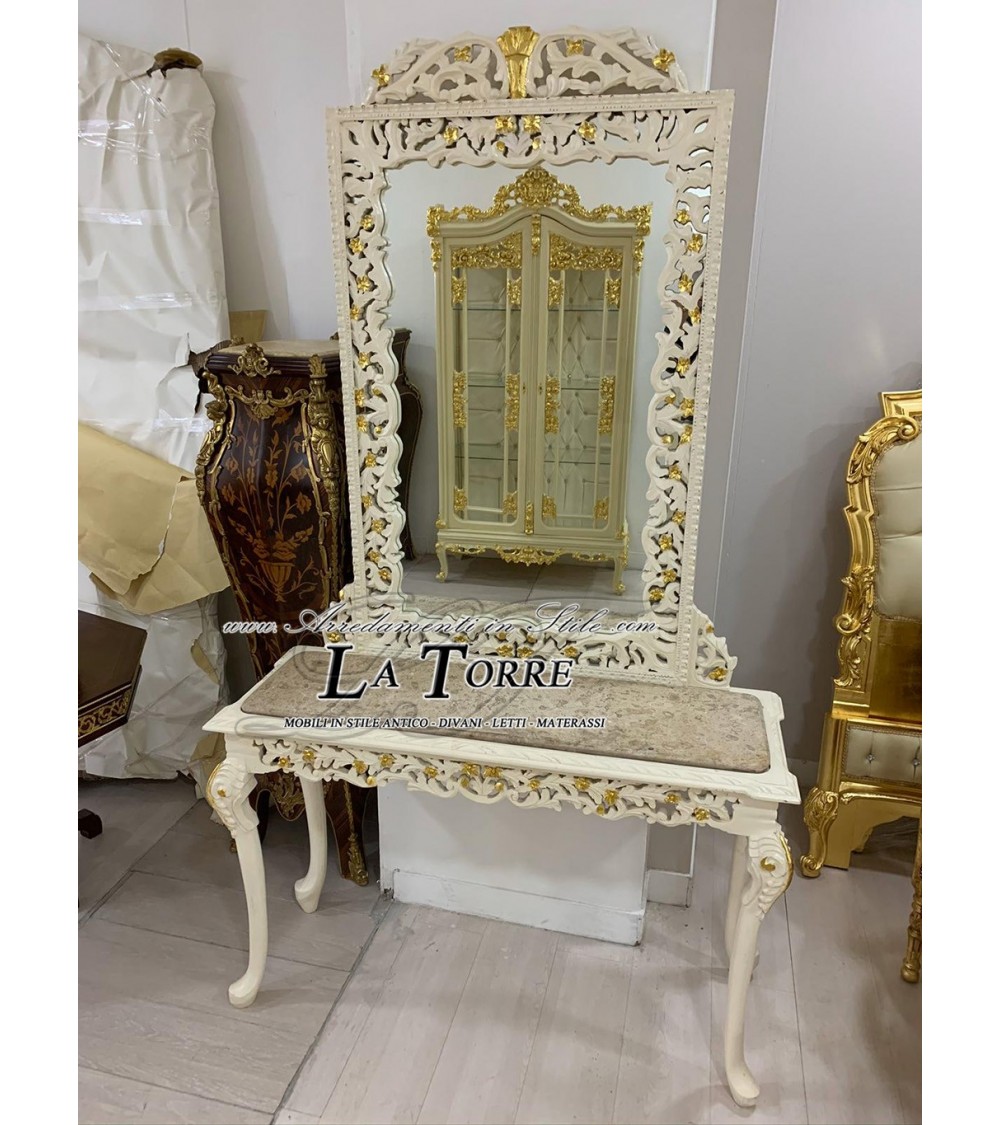 Baroque entrance wall console with mirror in wood and gold ivory marble AL09