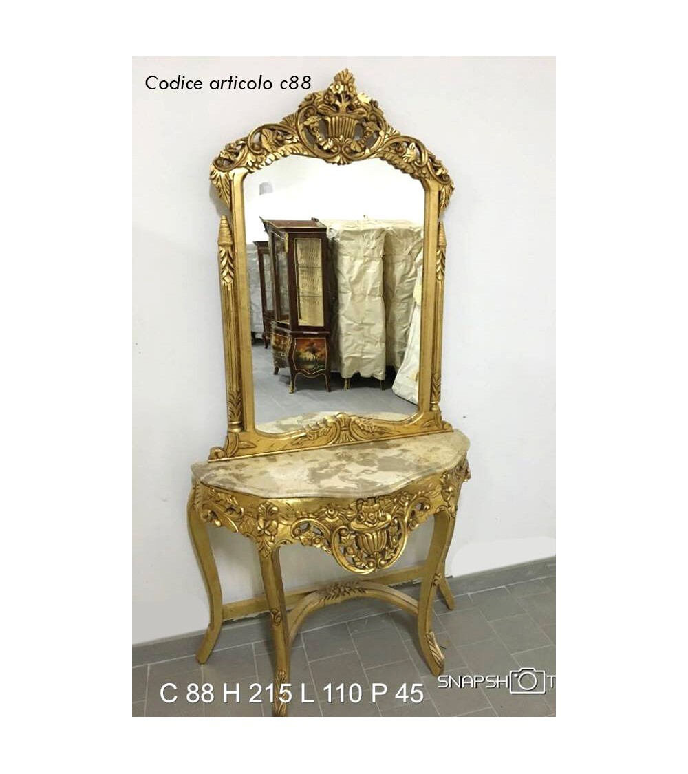French style carved console in wood, antique gold leaf entrance, marble mirror K88
