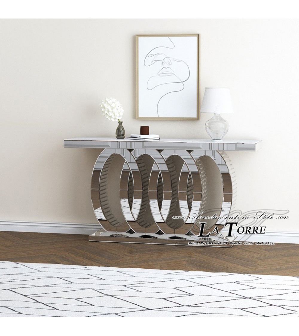 Bring refinement and light into your home with this modern mirrored console table, featuring a circular structure with great visual impact.