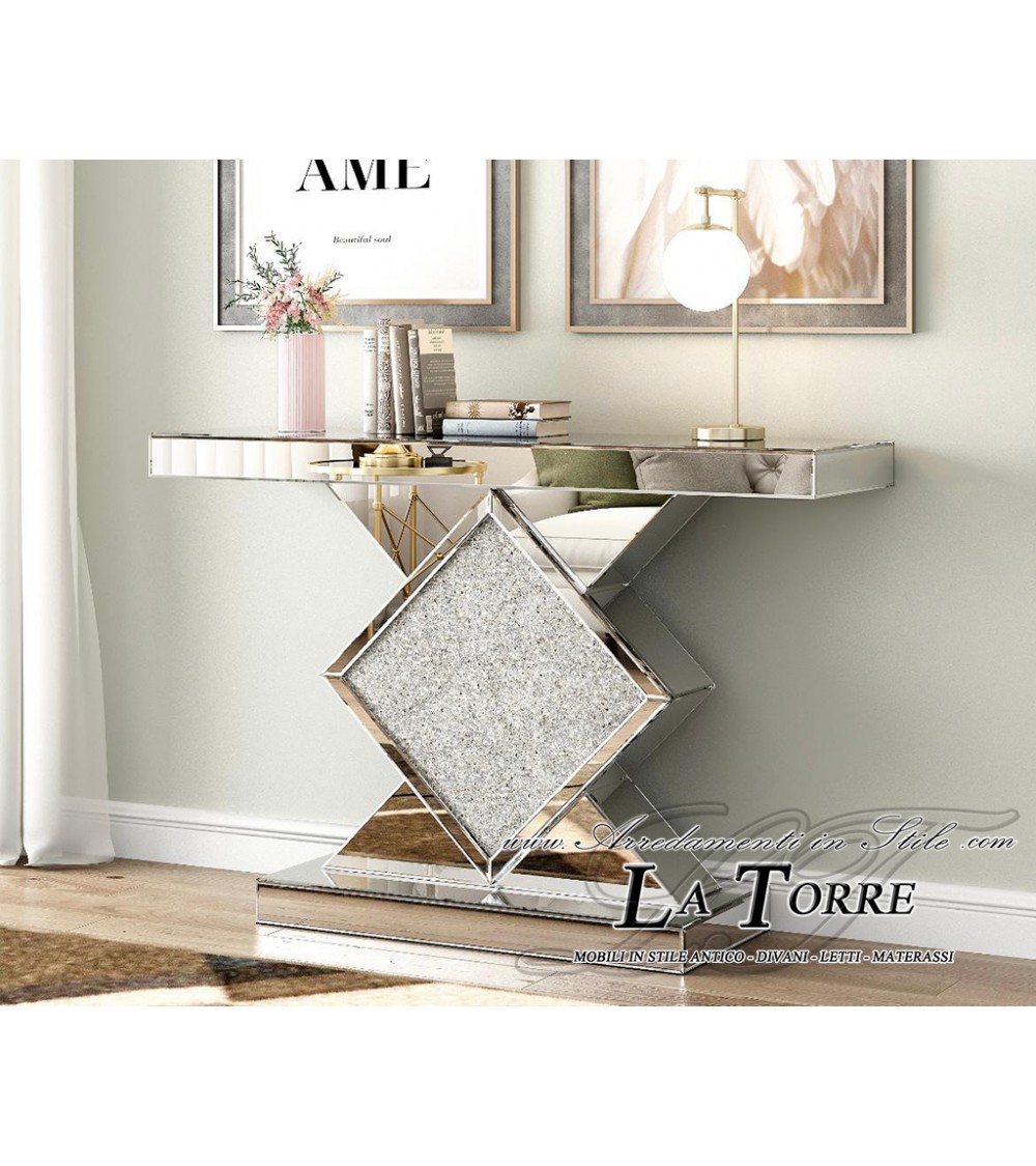 Add prestige and sophistication to your decor with this modern mirrored console table, featuring an exclusive geometric design and Swarovski details that capture the light, creating a luminous and spectacular effect.