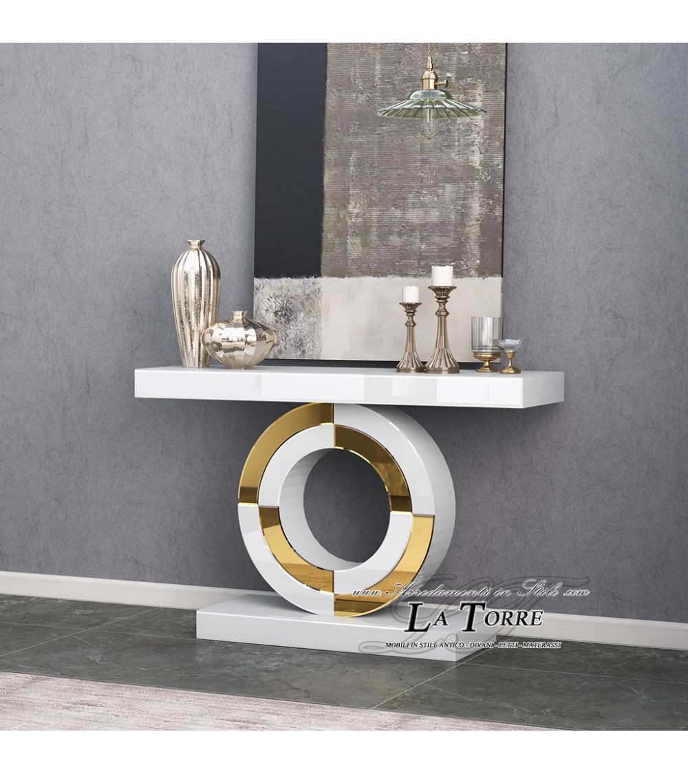 Modern console table in glossy white and gold with an elegant and refined design, ideal for entrances, living rooms and contemporary spaces.