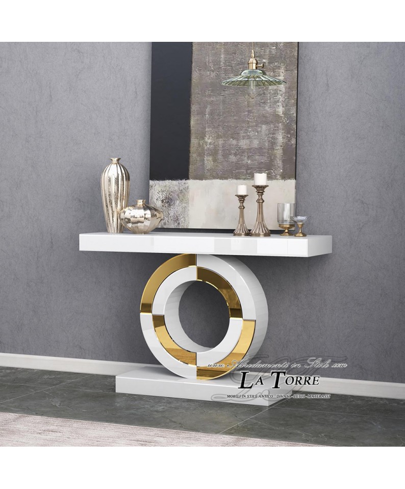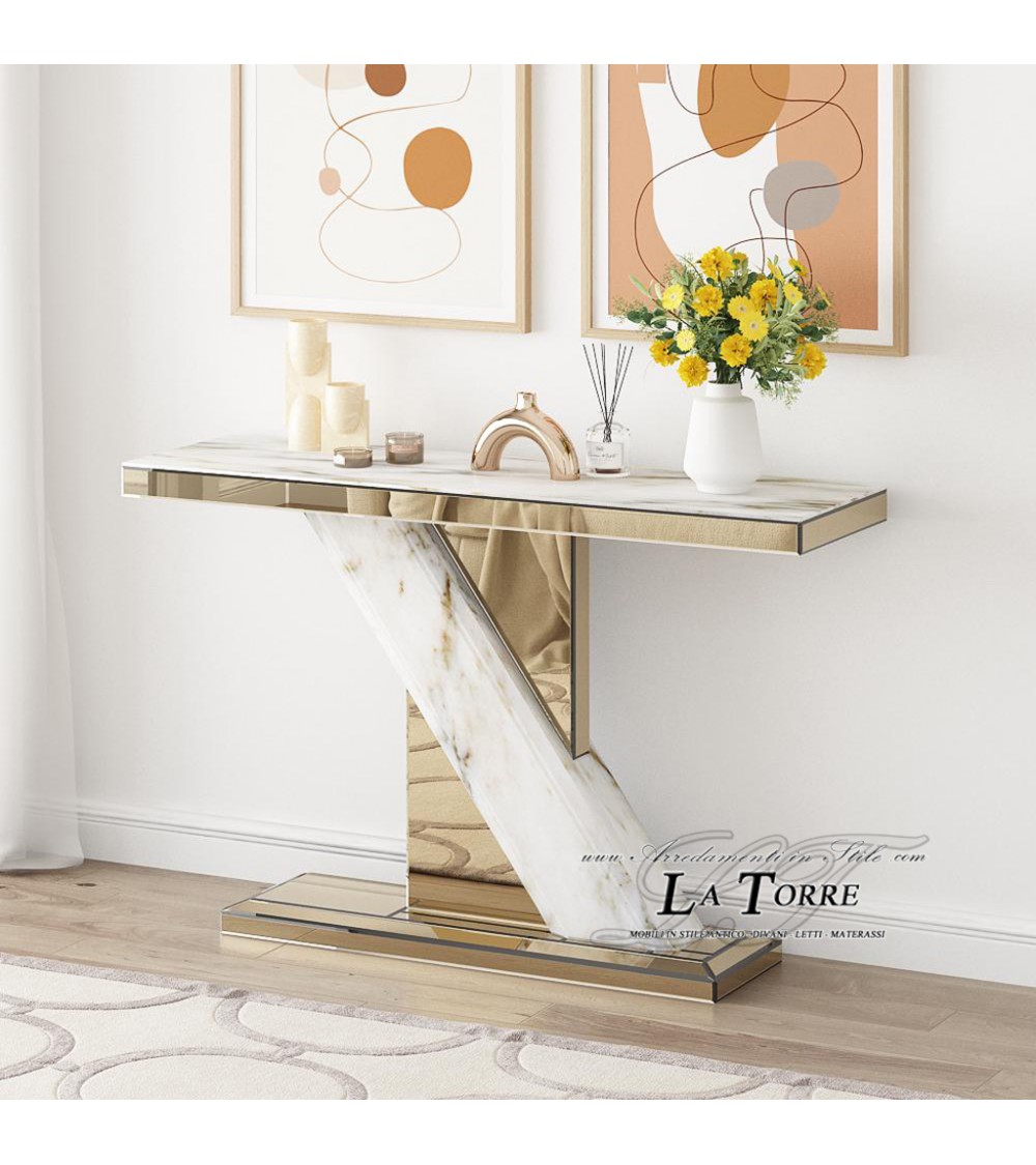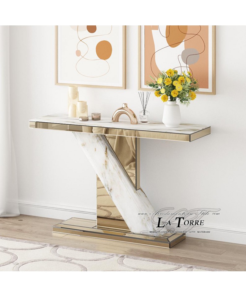Modern Console Table in Porcelain Stoneware and Gold – Luxury Entryway Table with Mirrored Top CB23N059